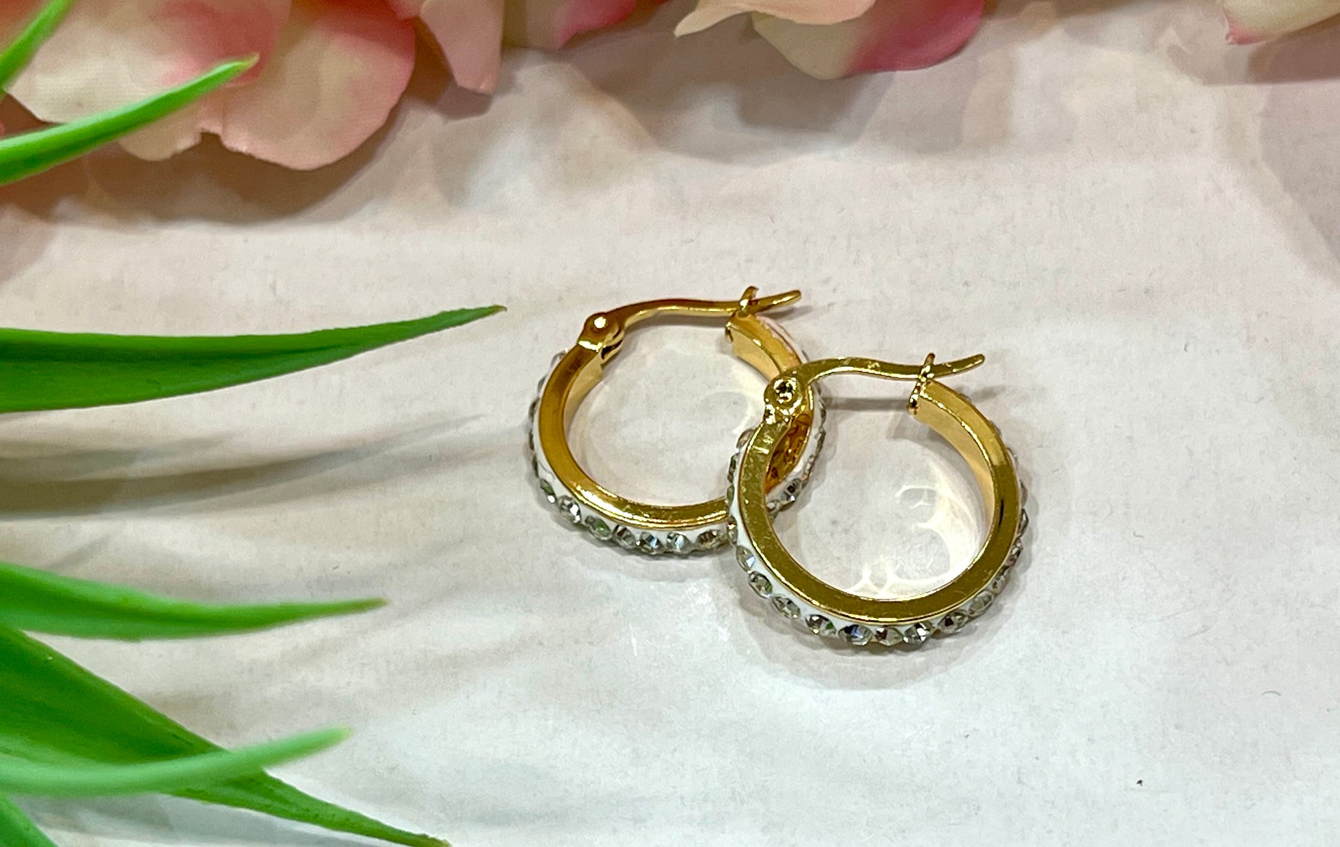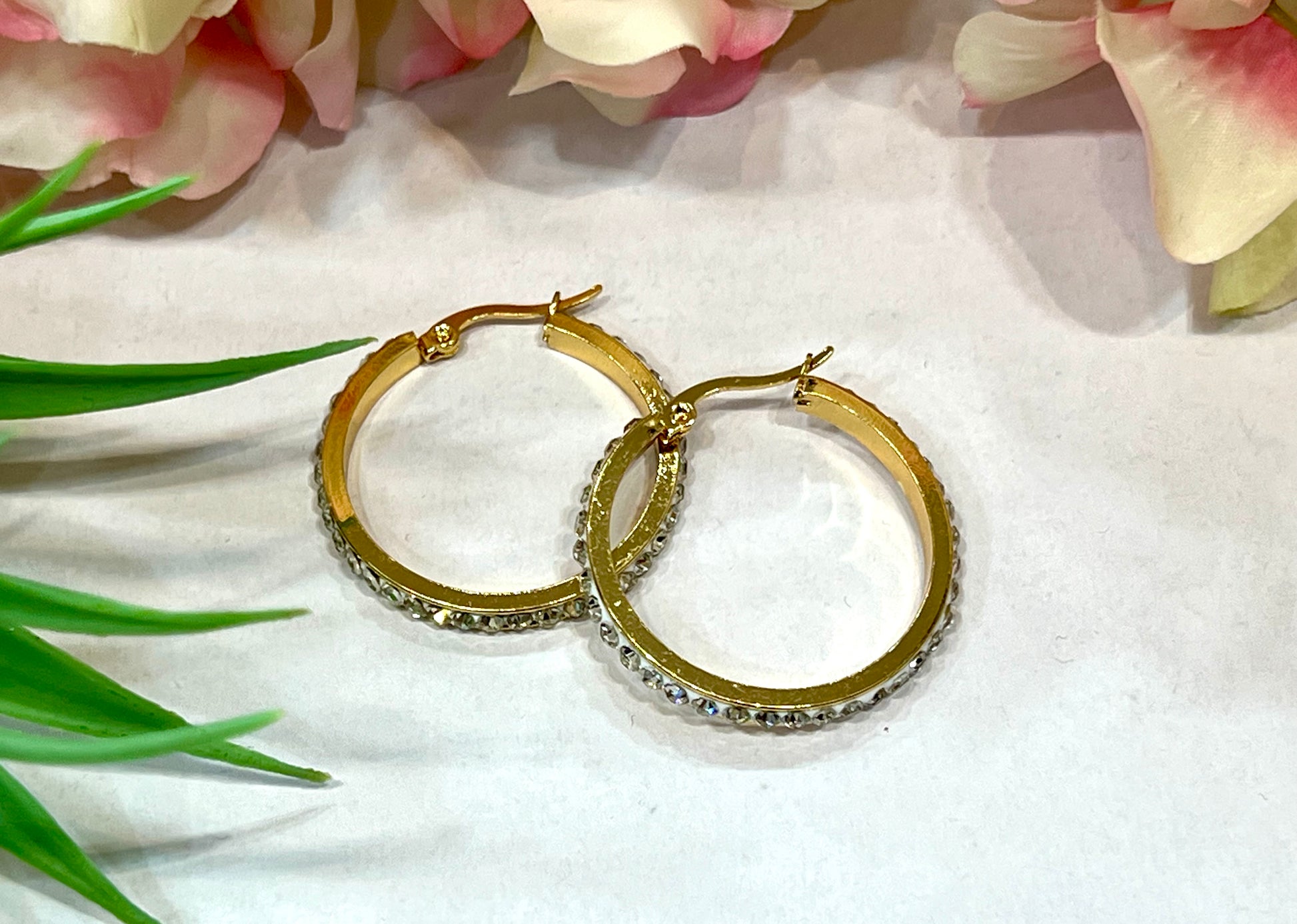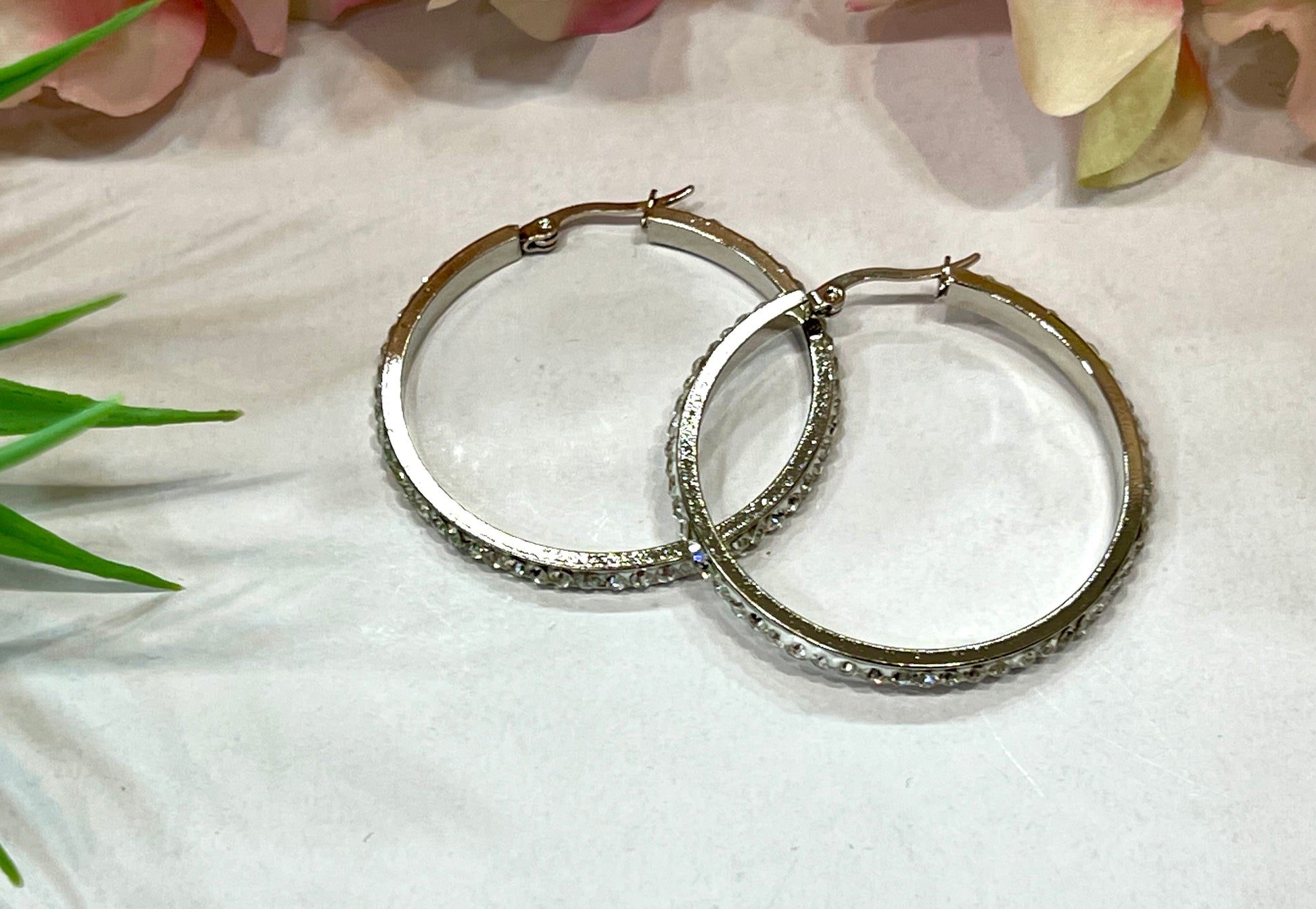 Pendientes de acero inoxidable con forma de aro con brillo alrededor. Cierre tipo omega. Acero quirúrgico e hipoalergénico, resistente al agua y al sudor. Medidas: pequeños (2cm), medianos (3,5cm) y grandes (4,5 cm).