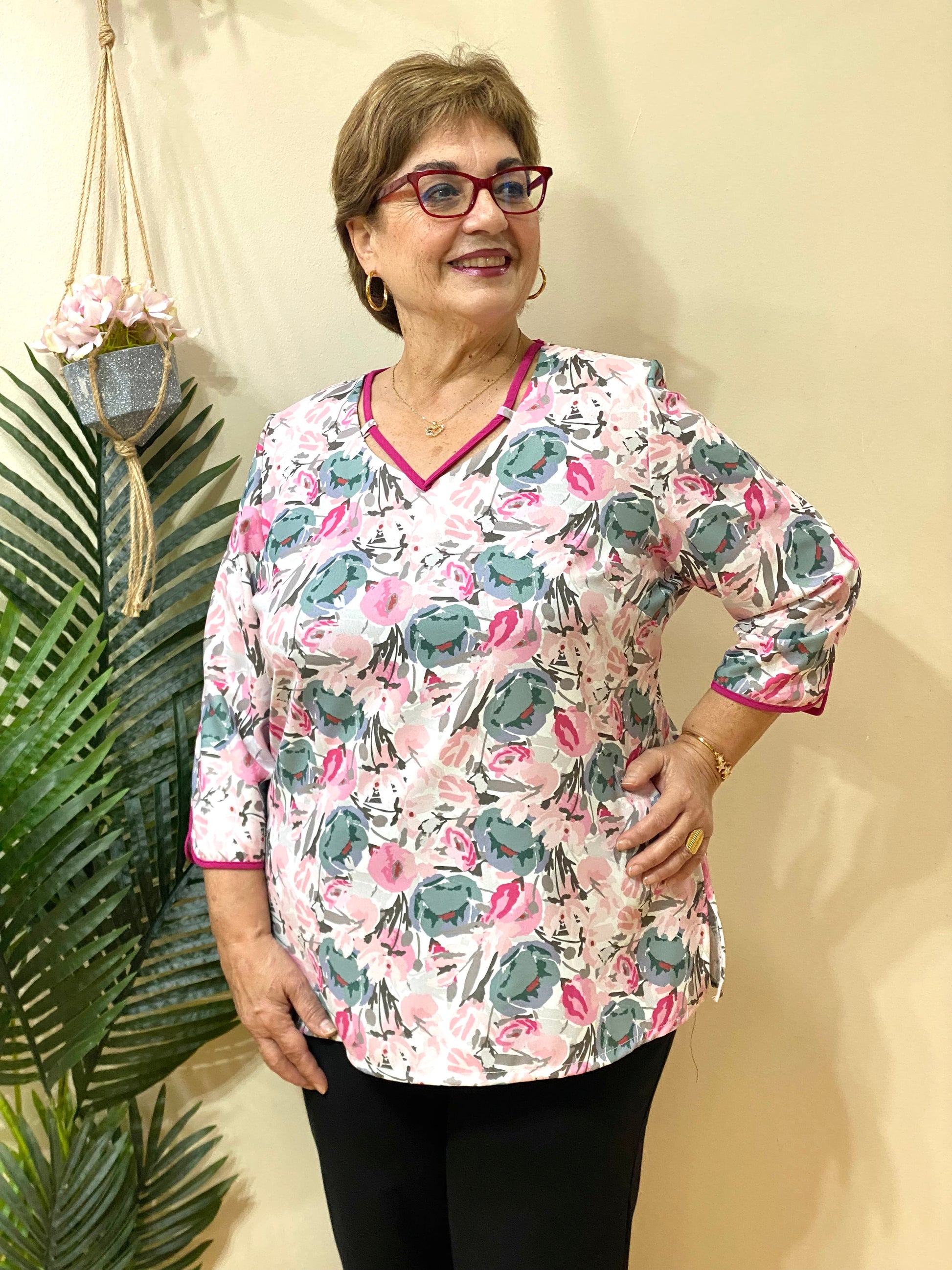 Blusa estampada con escote de pico con presillas y cinta entremetida. Manga tres cuartos con remate igual a la cinta del escote. Fabricación nacional y tallaje muy amplio. Composición: 100%poliester de calidad.