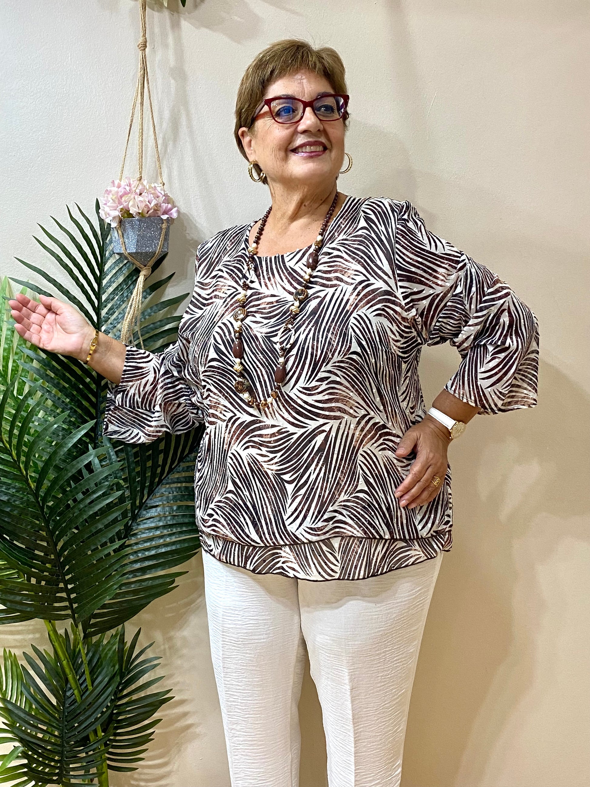 Blusa de tejido plumeti con estampado de hojas. Escote a la caja y manga de capa. Dispone de forro a modo de doble faldón. Trae hombreras. Fabricación nacional. Por tallas (desde la M hasta las 3XL). Composición: 92%poliester y 8% elastomero.