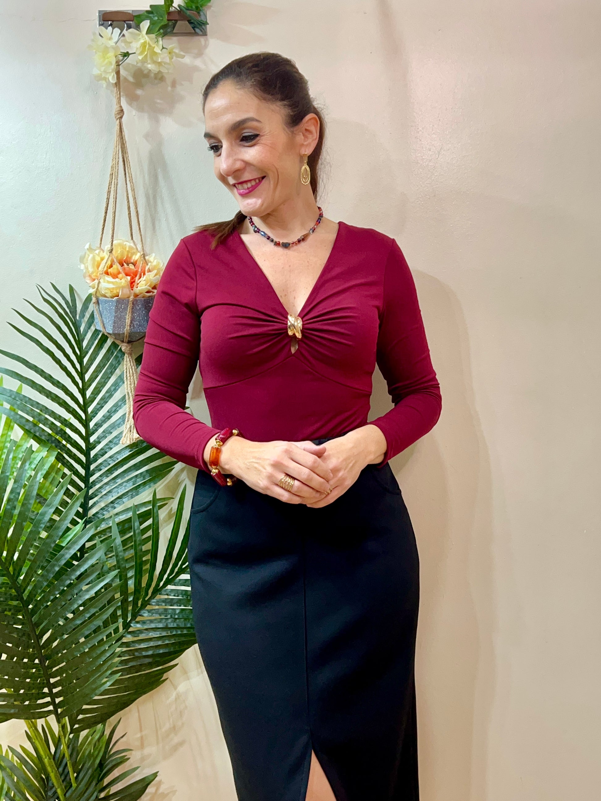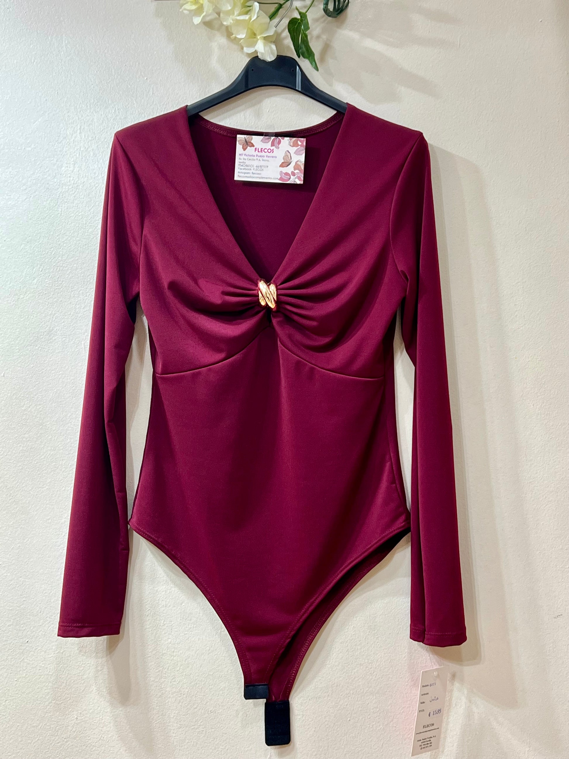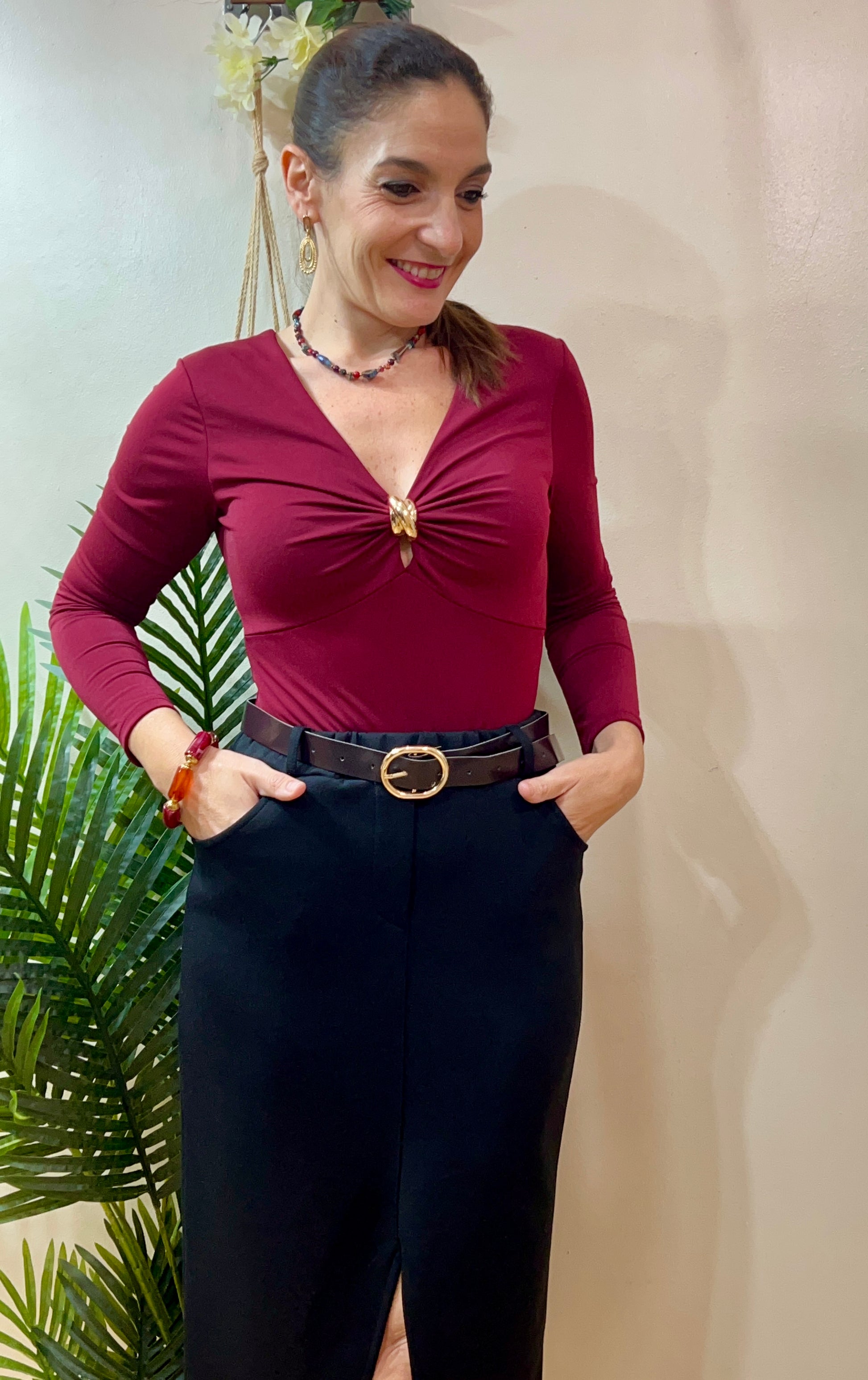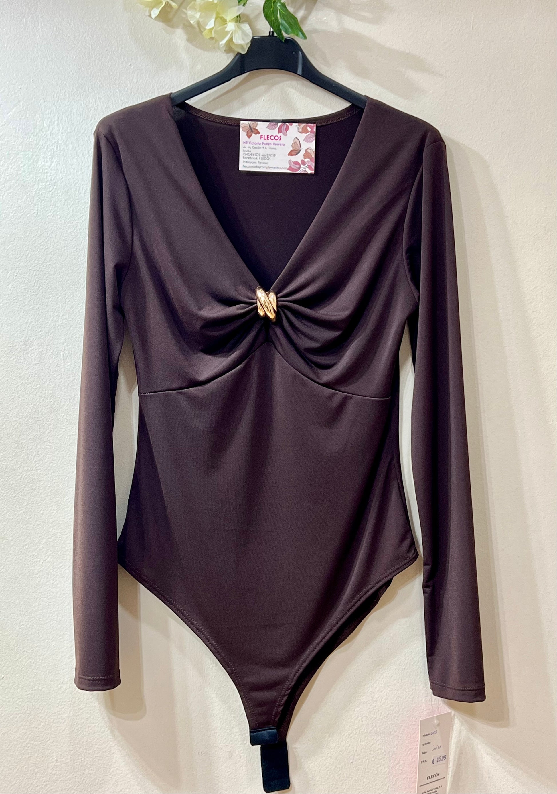 Body de punto de licra con detalle de aplique dorado en el centro del escote. Cierre del body con corchetes. Talla única (perfecto para tallas 36, 38 y 40). Medidas: ancho de sisa a sisa 37 cm y largo 70cm (hasta el cierre). Composición: 95% poliester y 5% elastán.