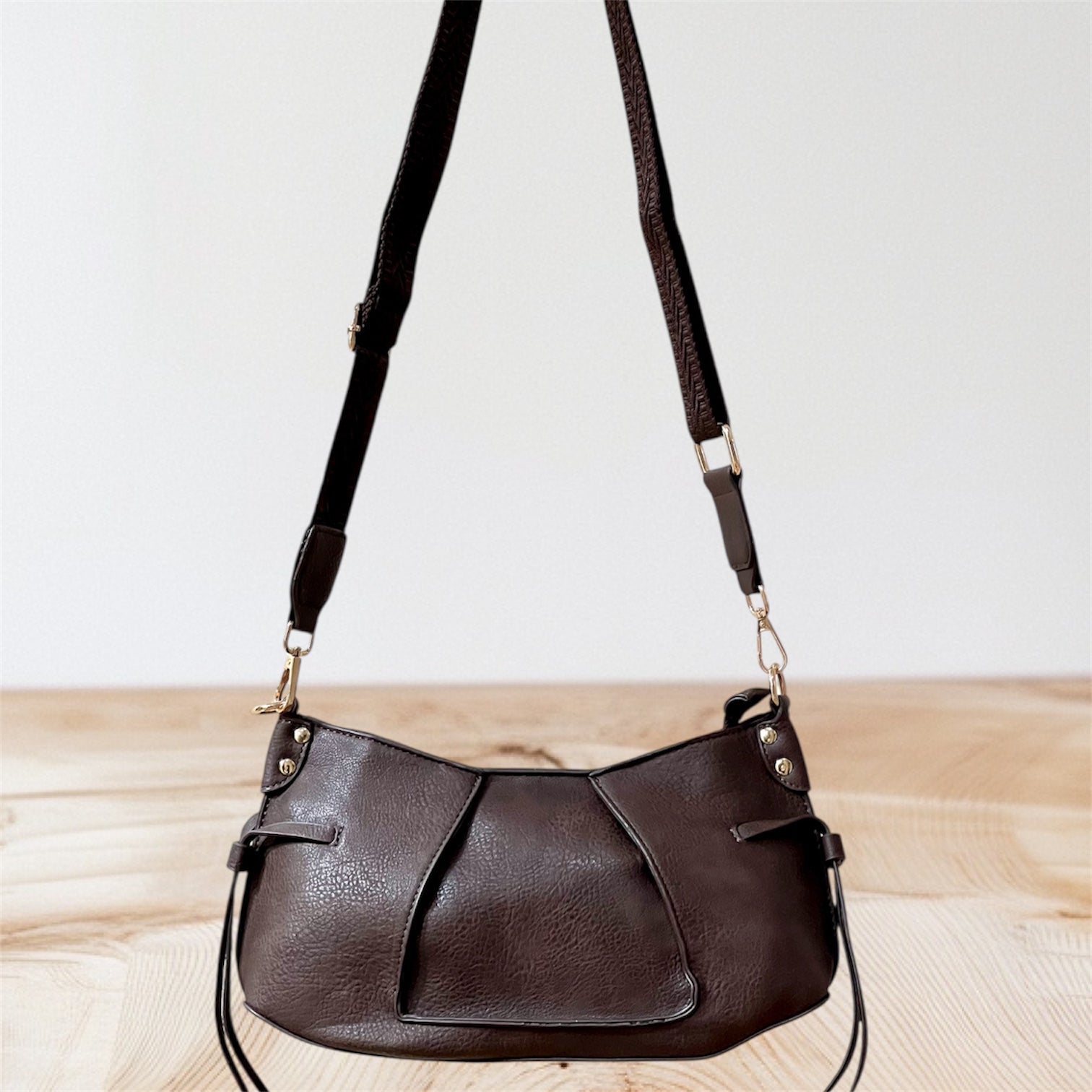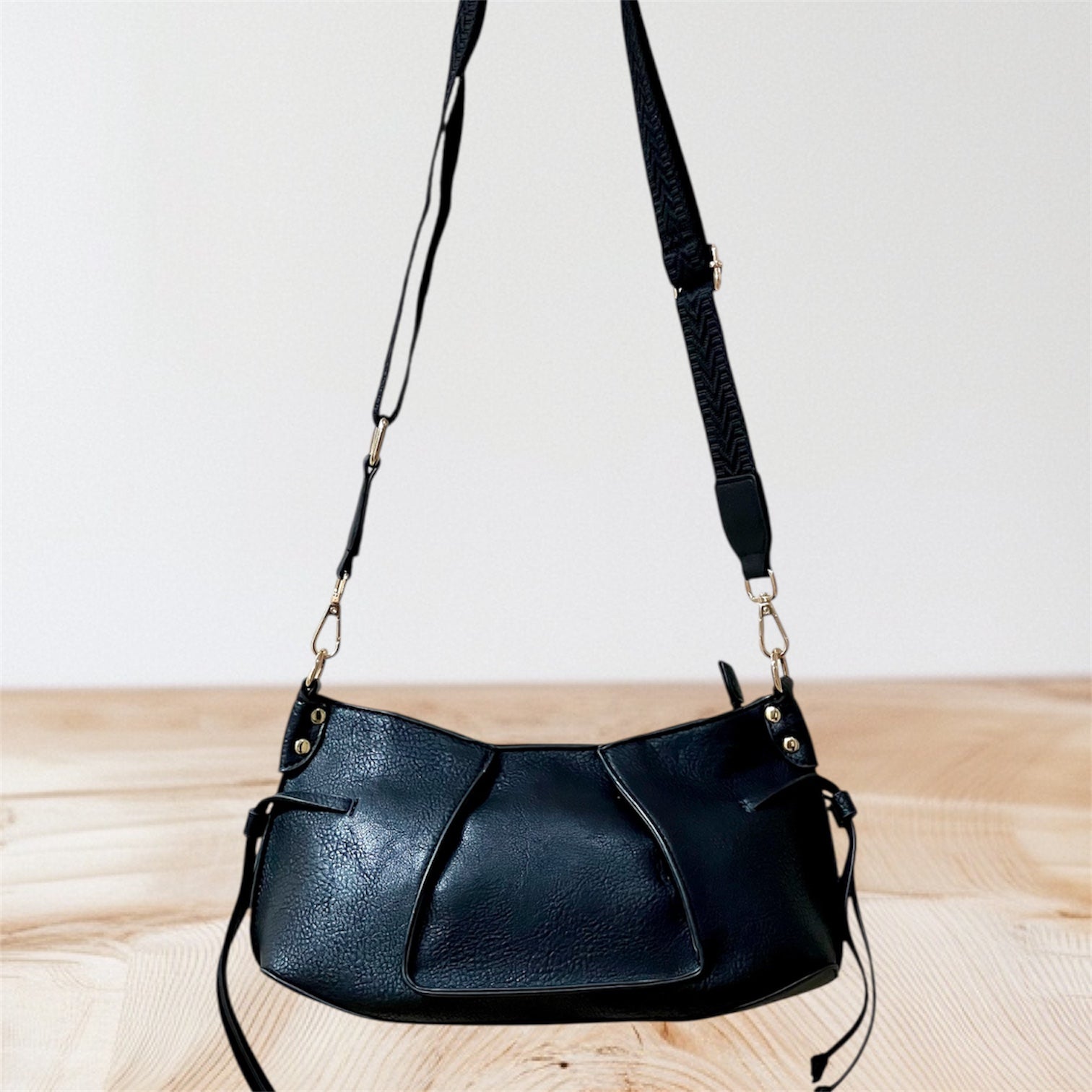 Bolso de polipiel con pespuntes centrales formando un cuadrado asimétrico. Asa regulable. Cierre de cremallera y bolsillo interior. Composición: 100% poliester.