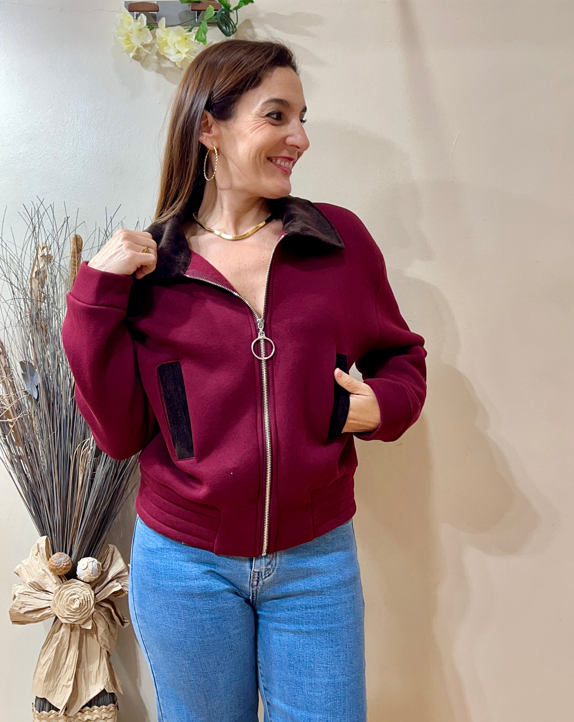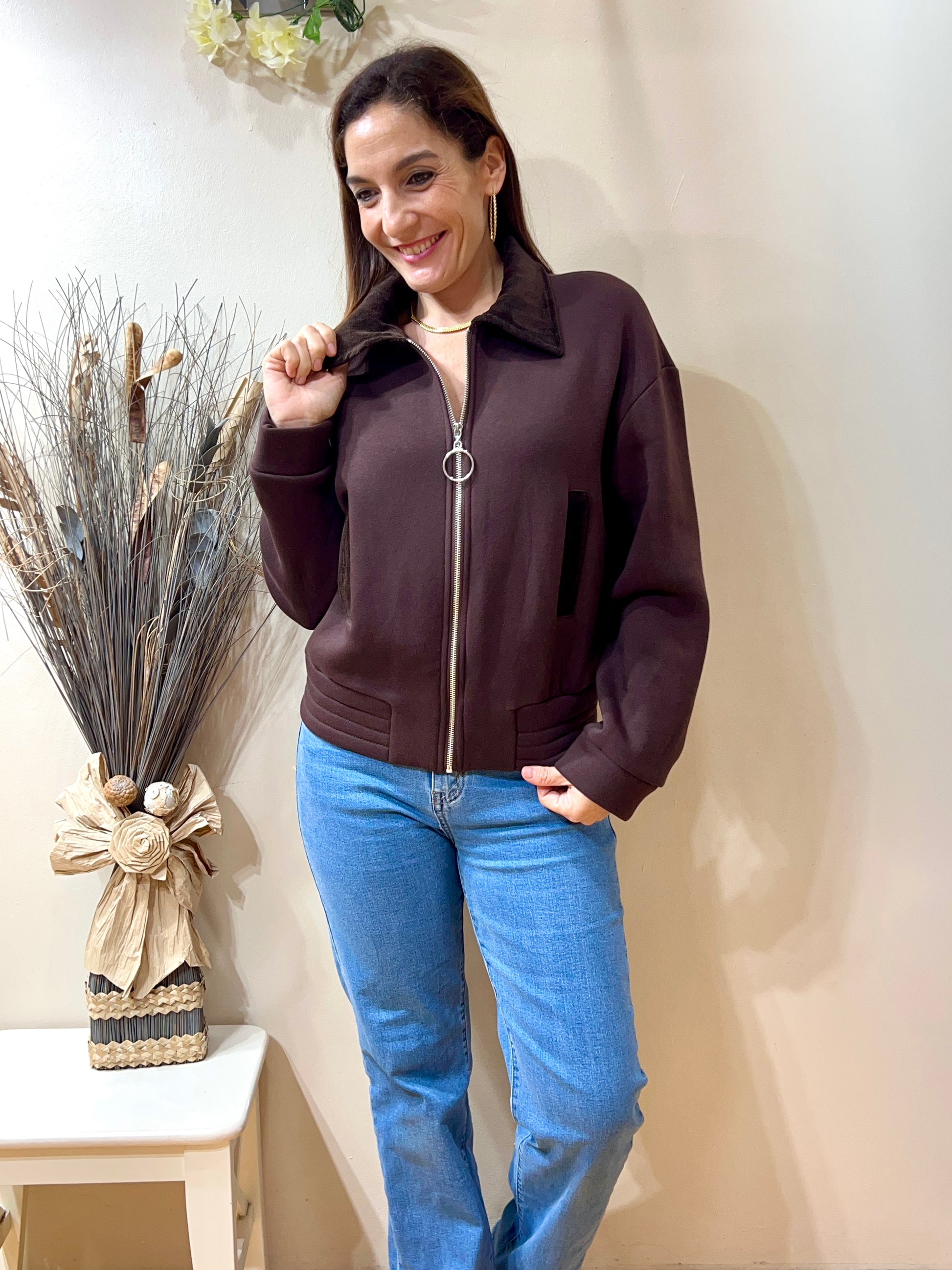 Chaquetón tipo bomber con detalles de micropana en cuello y bolsillos. Cierre de cremallera. Interior tipo polar (muy abrigada). Talla única (amplia). Medidas: ancho 53 cm y largo 55cm. Composición: 65% algodón y 35% poliéster.