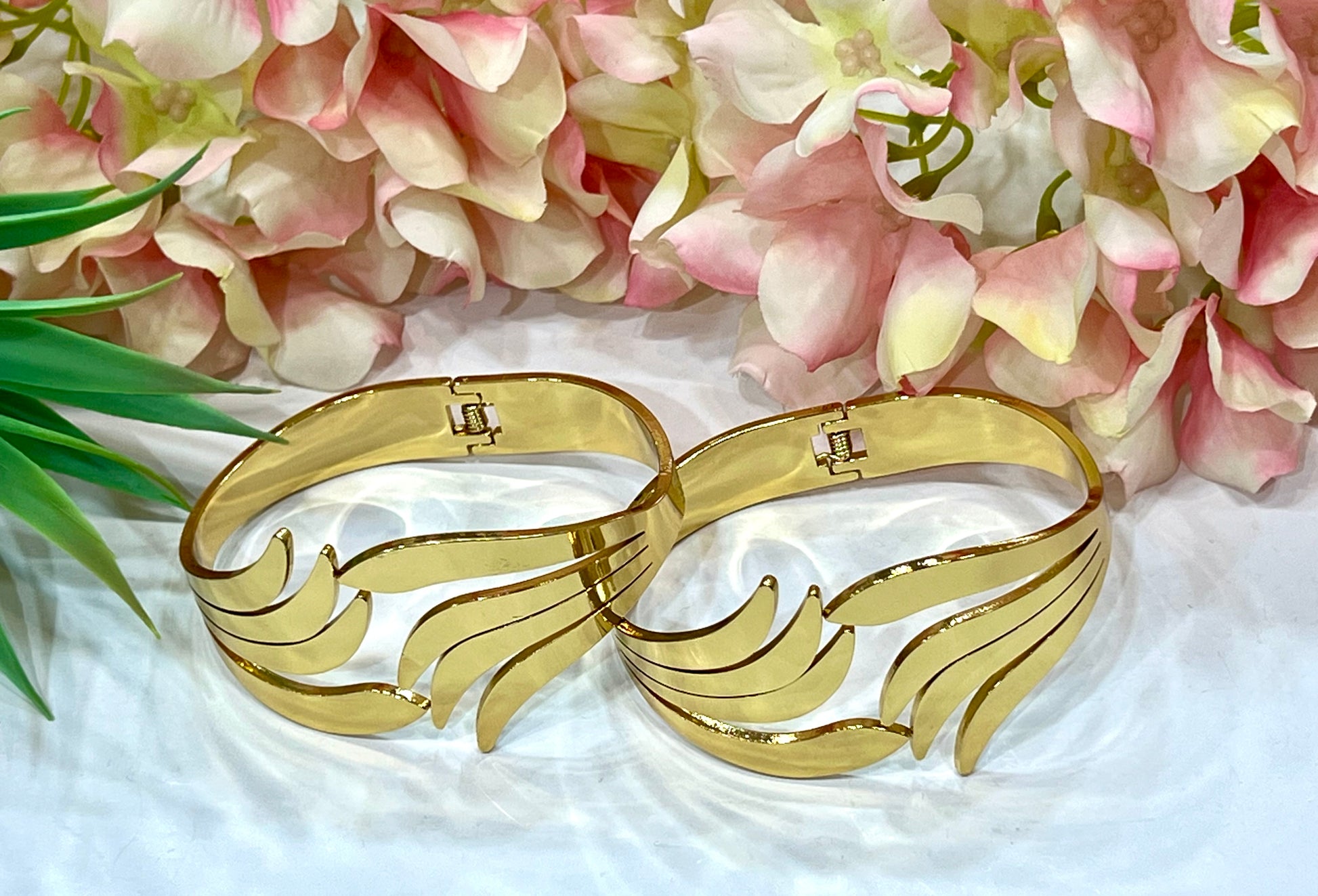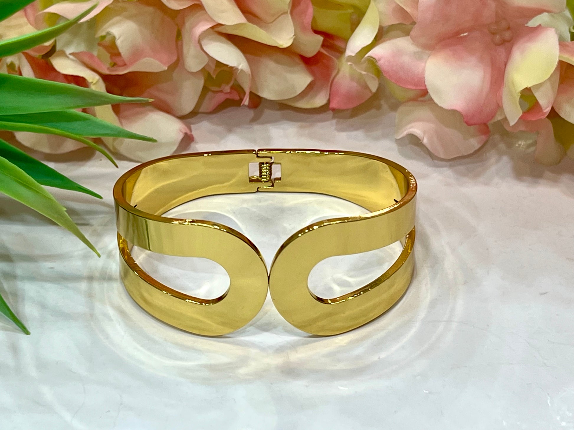 Brazaletes en acero inoxidable dorado, formas variadas. Acero quirúrgico e hipoalergénico, resistente al agua y al sudor.