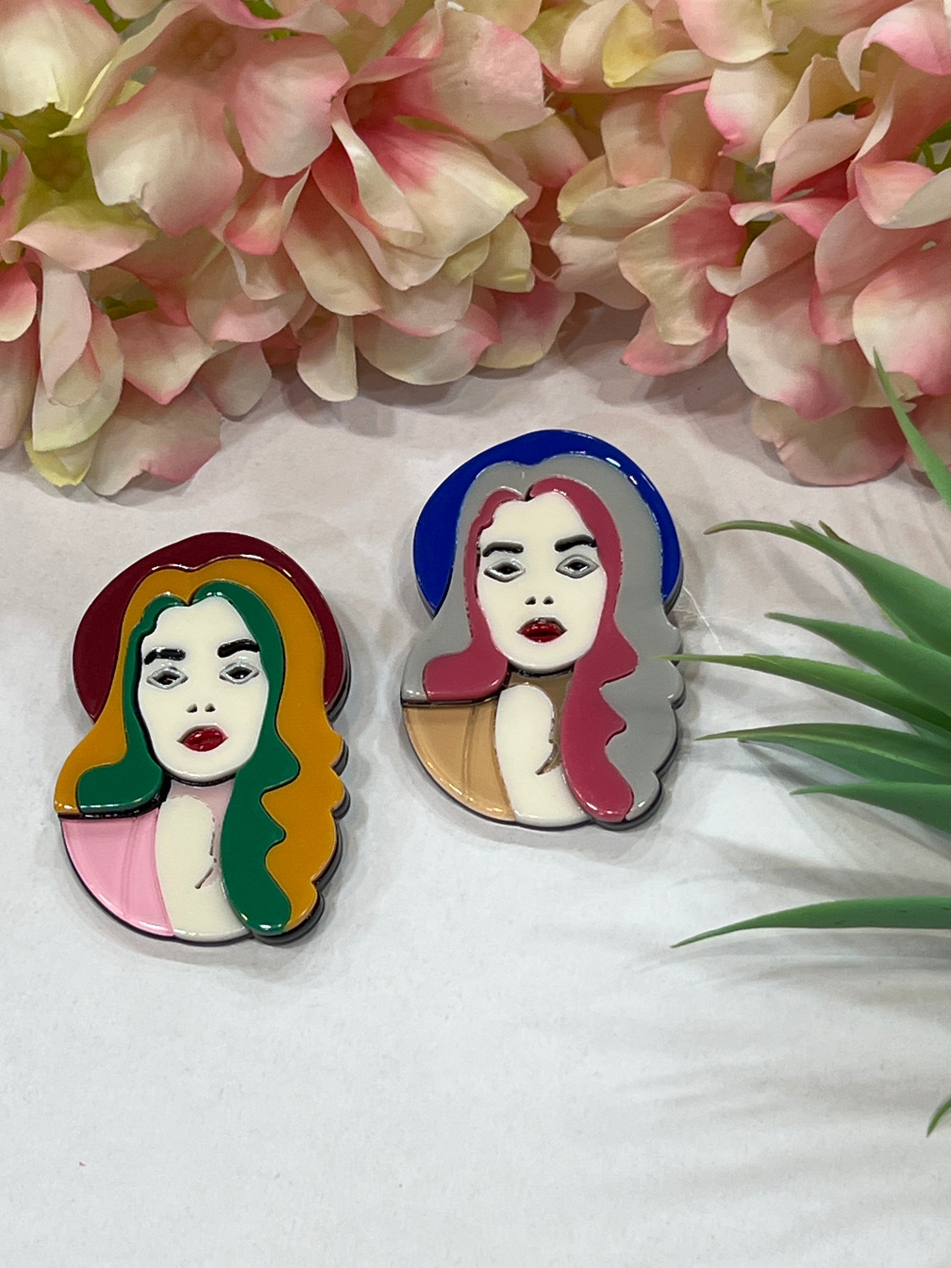 Broche de solapa con muñeca con melena larga. Material: resina. Largo: 6cm.