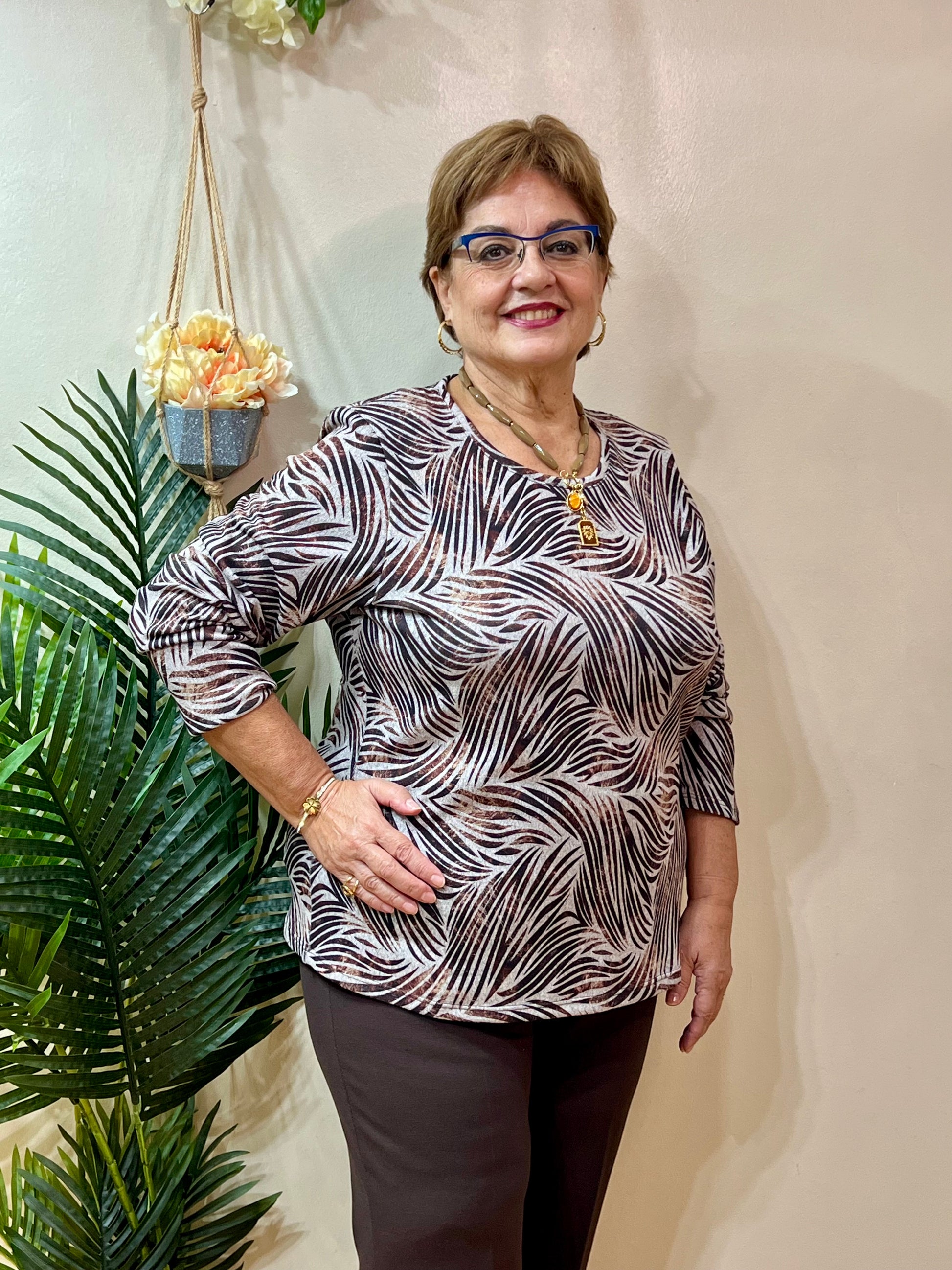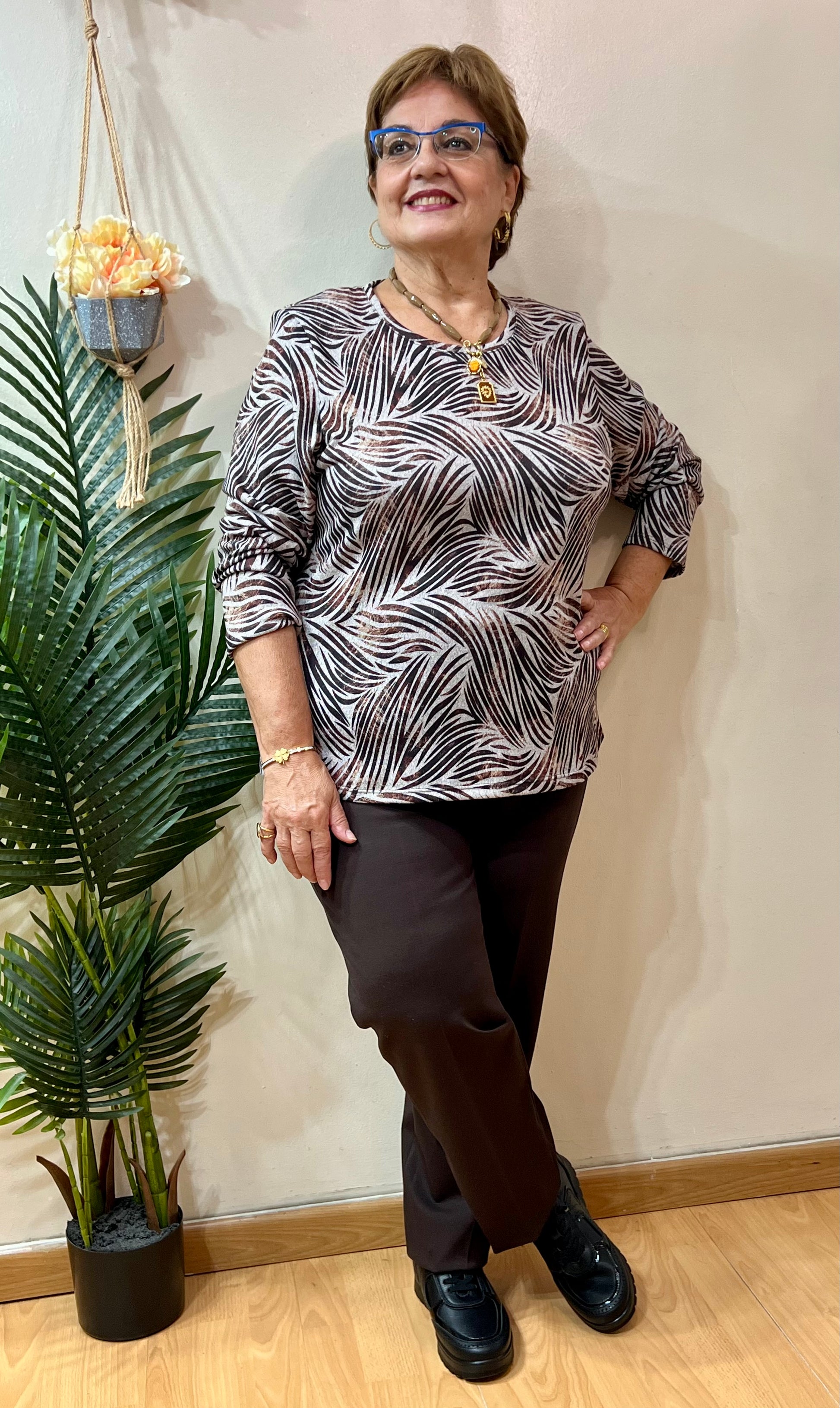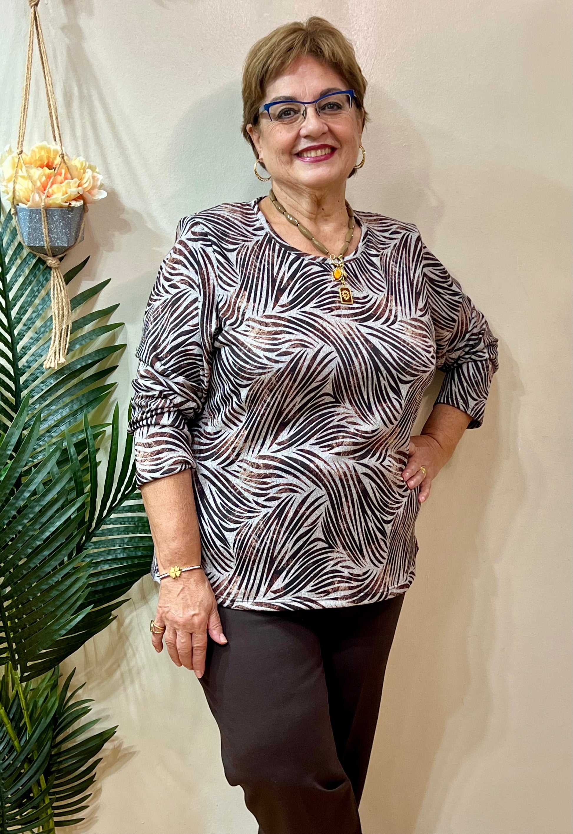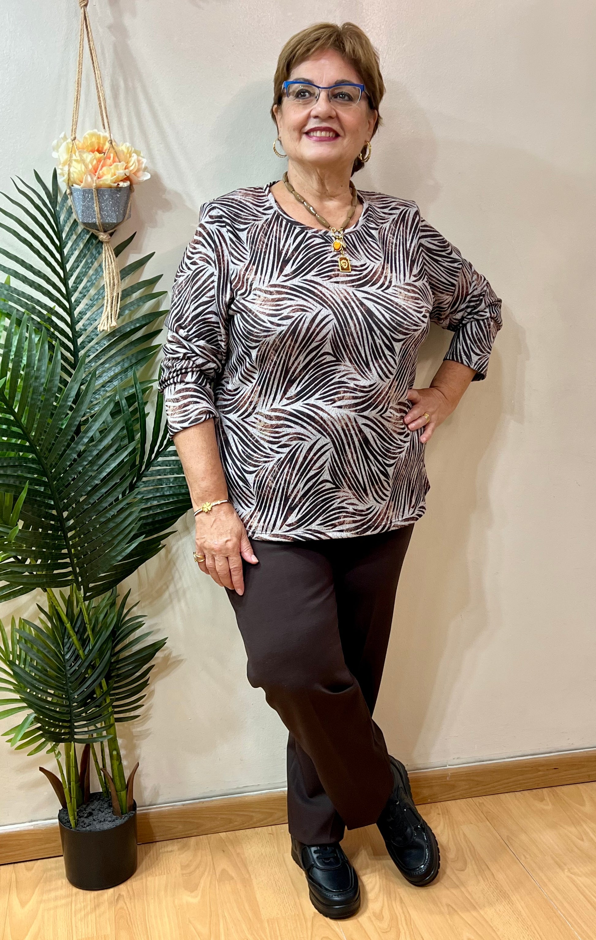Camiseta estampada en rayas/hojas marrones sobre fondo gris suave. Escote a la caja. Manga larga, hombreras, fabricación nacional con terminaciones de calidad. Por tallas. Tejido 92%poliester y 8% elastomero.