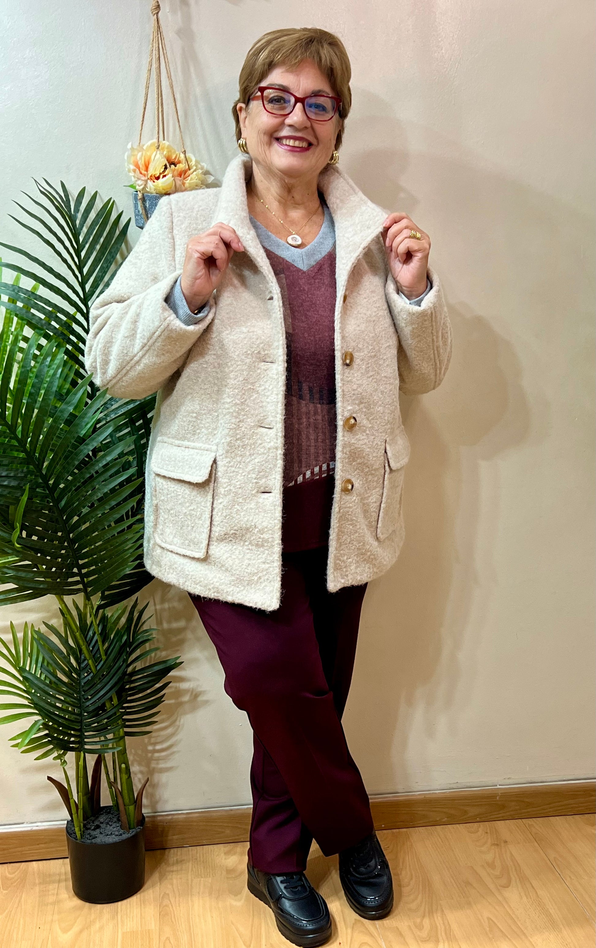 Chaquetón de borreguito abotonado y con bolsillos de parches. Con forro y hombreras. Trae costura en costado lo. Alta calidad. Fabricación nacional. Por tallas . Composición: 100% poliester.