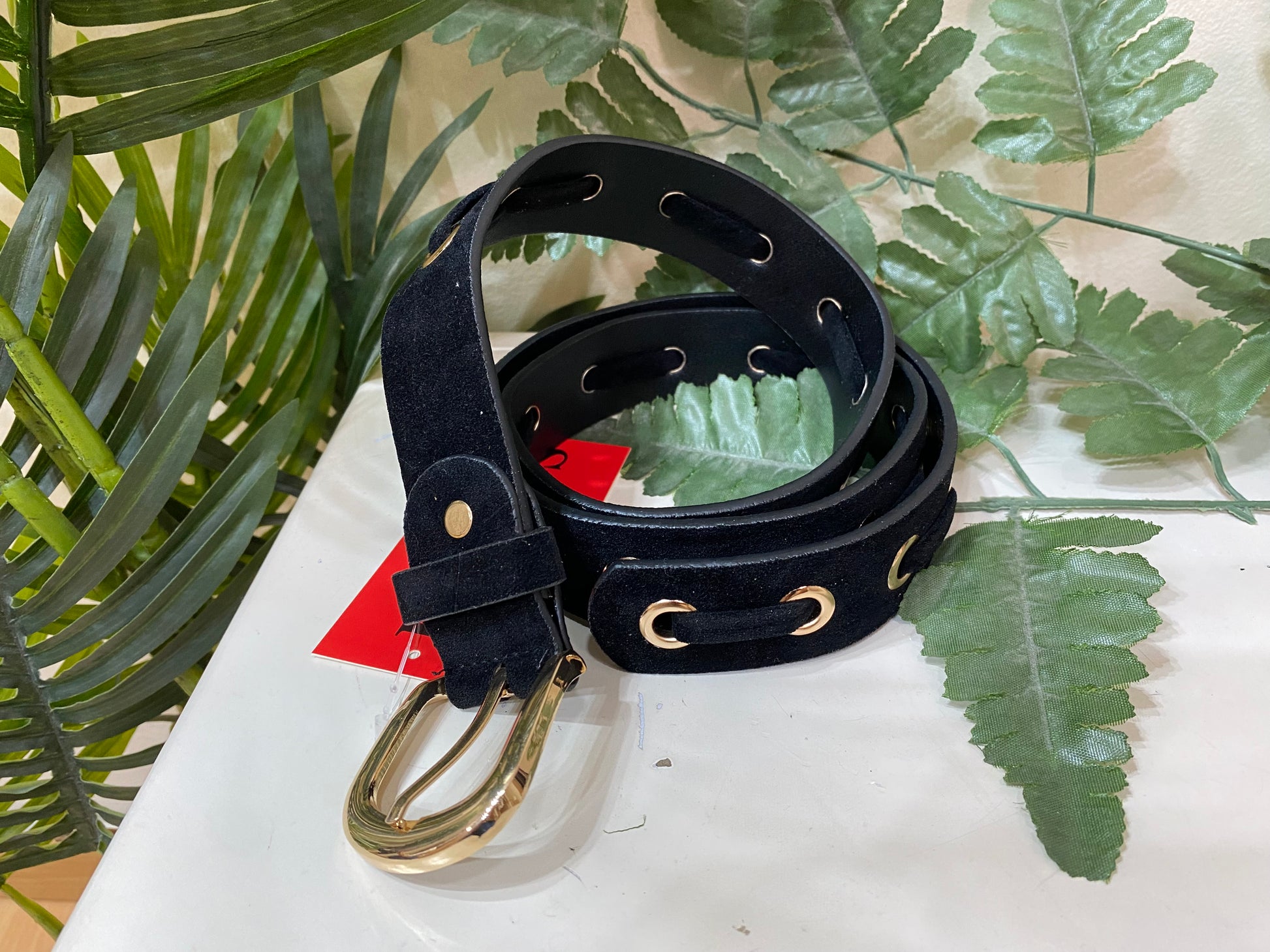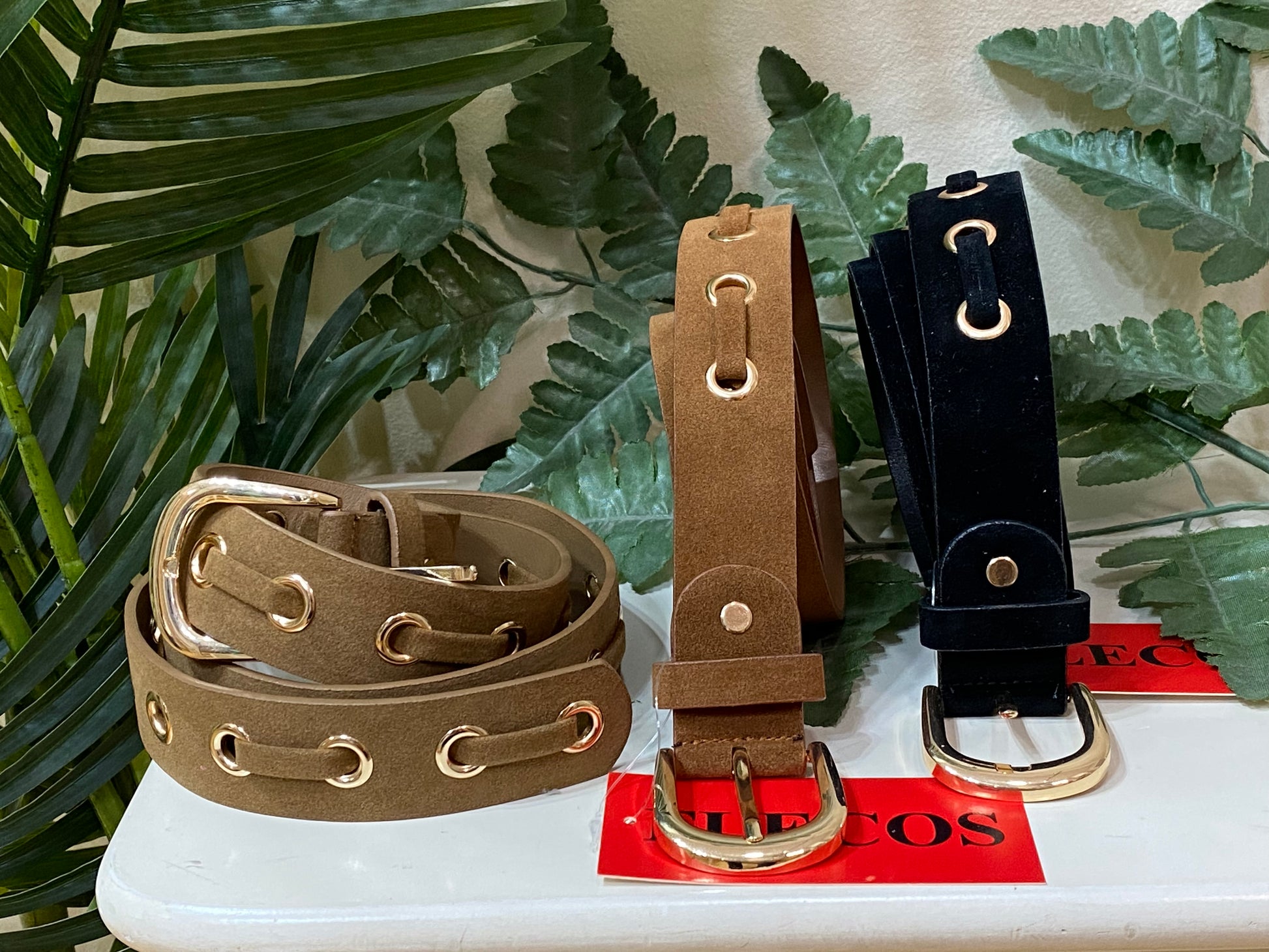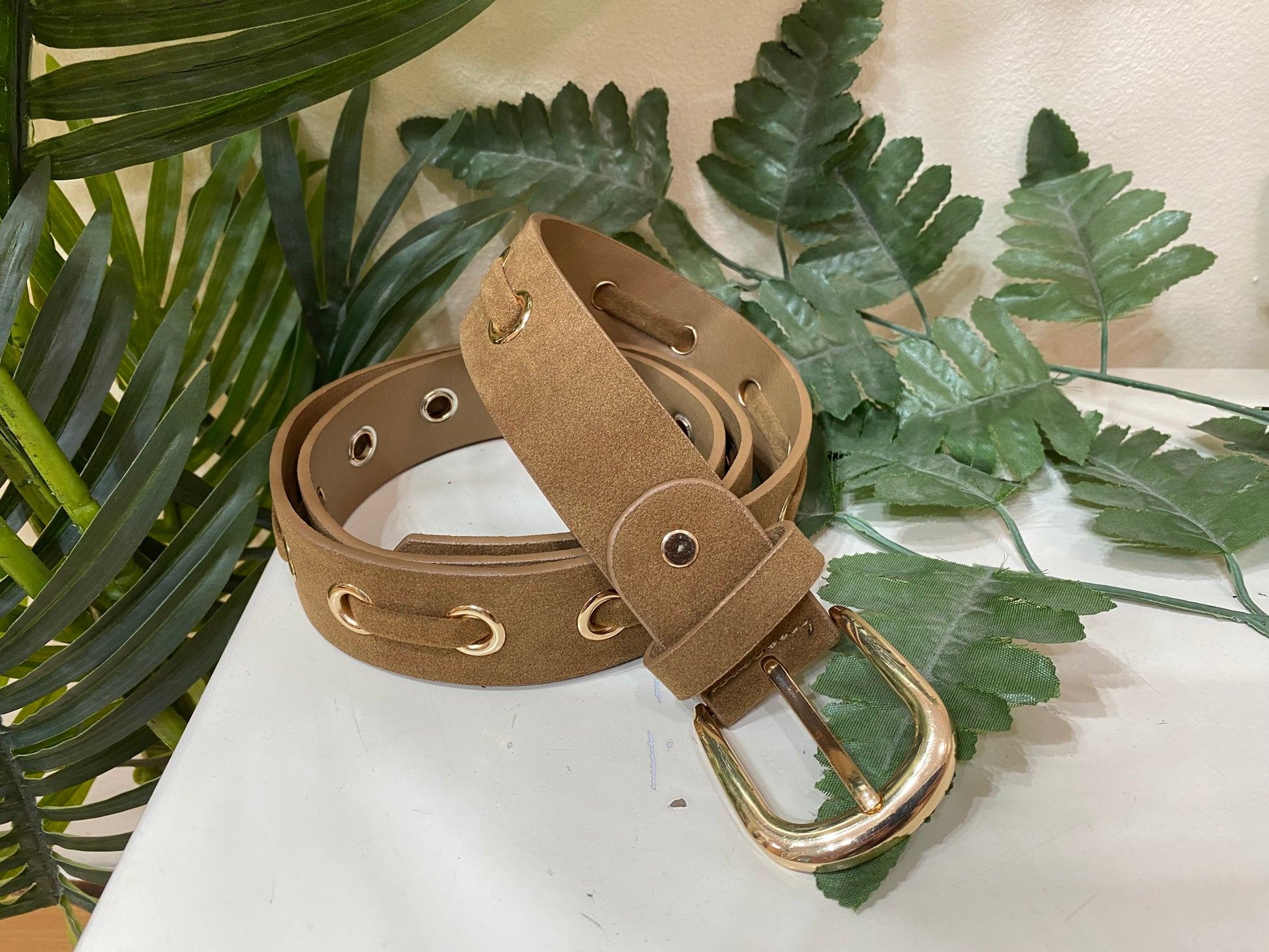 Cinturón en antelina con ojales circulares y cinta entrelazada. Hebilla dorada. Medida: 100cm.