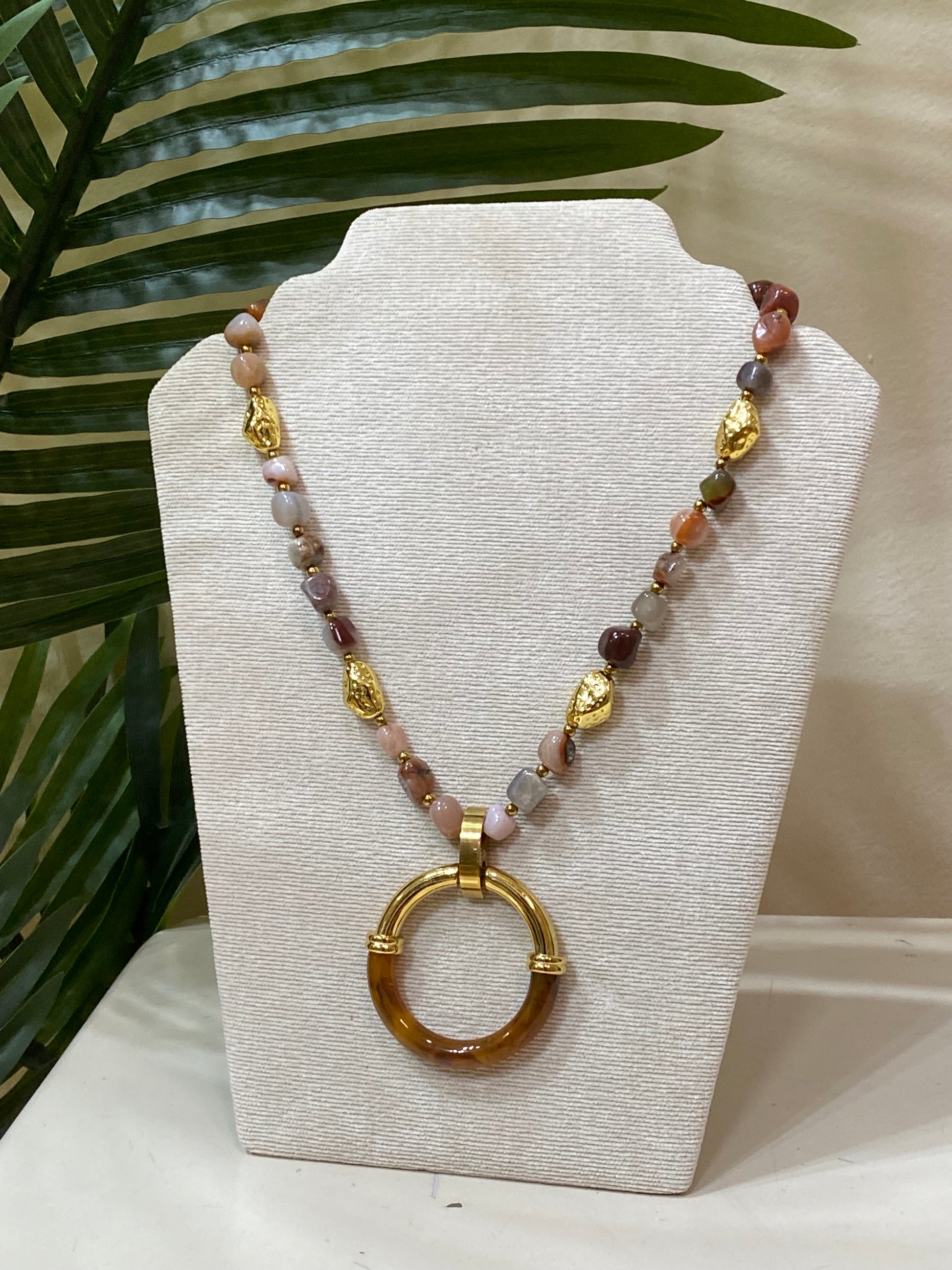 Collar de acero inoxidable que combina piedra natural con fornituras circulares en acero dorado. Mantiene un aro central mitad acero y mitad piedra. Aceró hipoalergénico y quirúrgico, resistente al agua y al sudor. Largo: 40+ 5 cm.