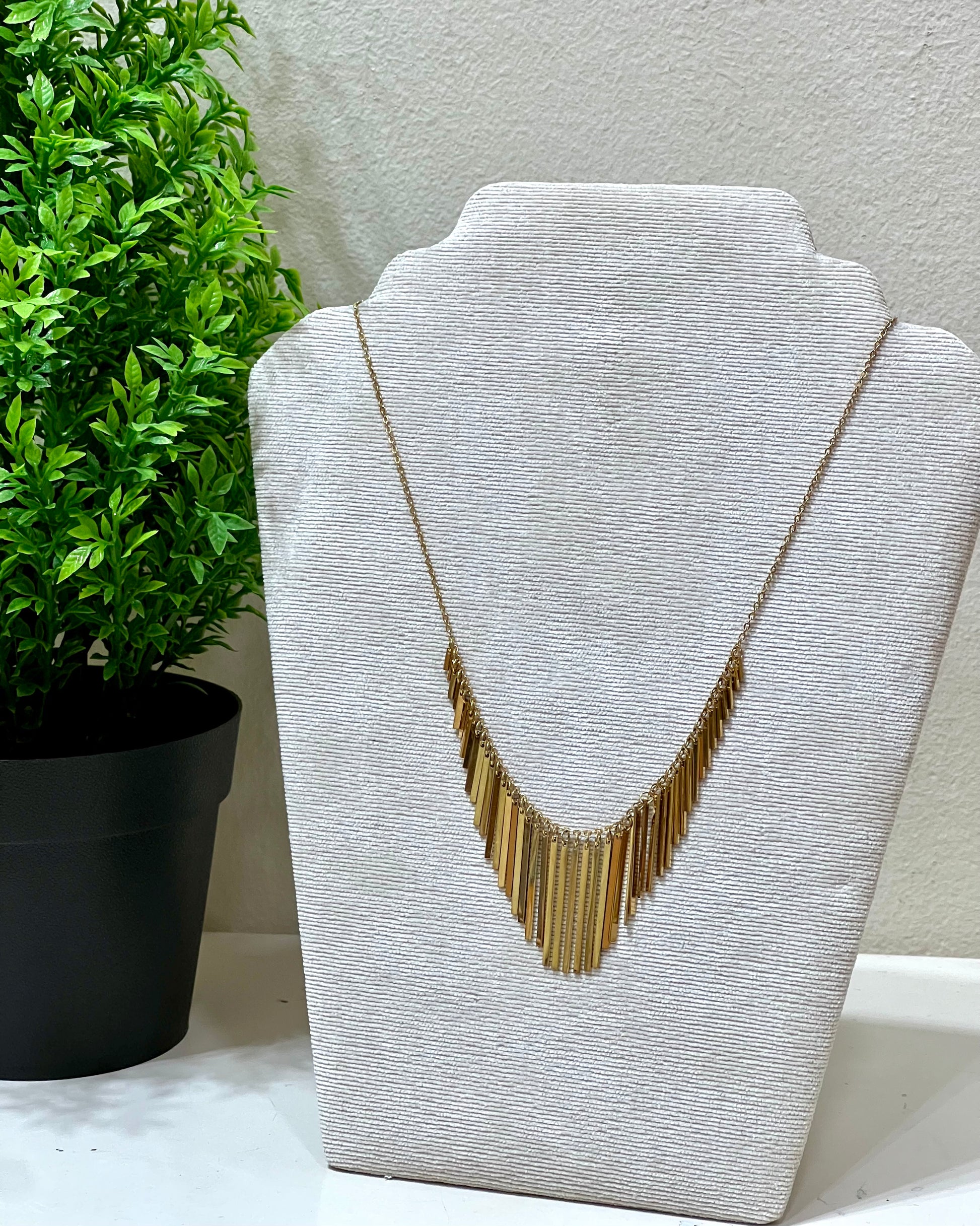 Collar de acero inoxidable con fornituras alargadas formando una cascada central. Acero quirúrgico e hipoalergénico, resistente al agua y al sudor. Largo total: 40+ 5cm.
