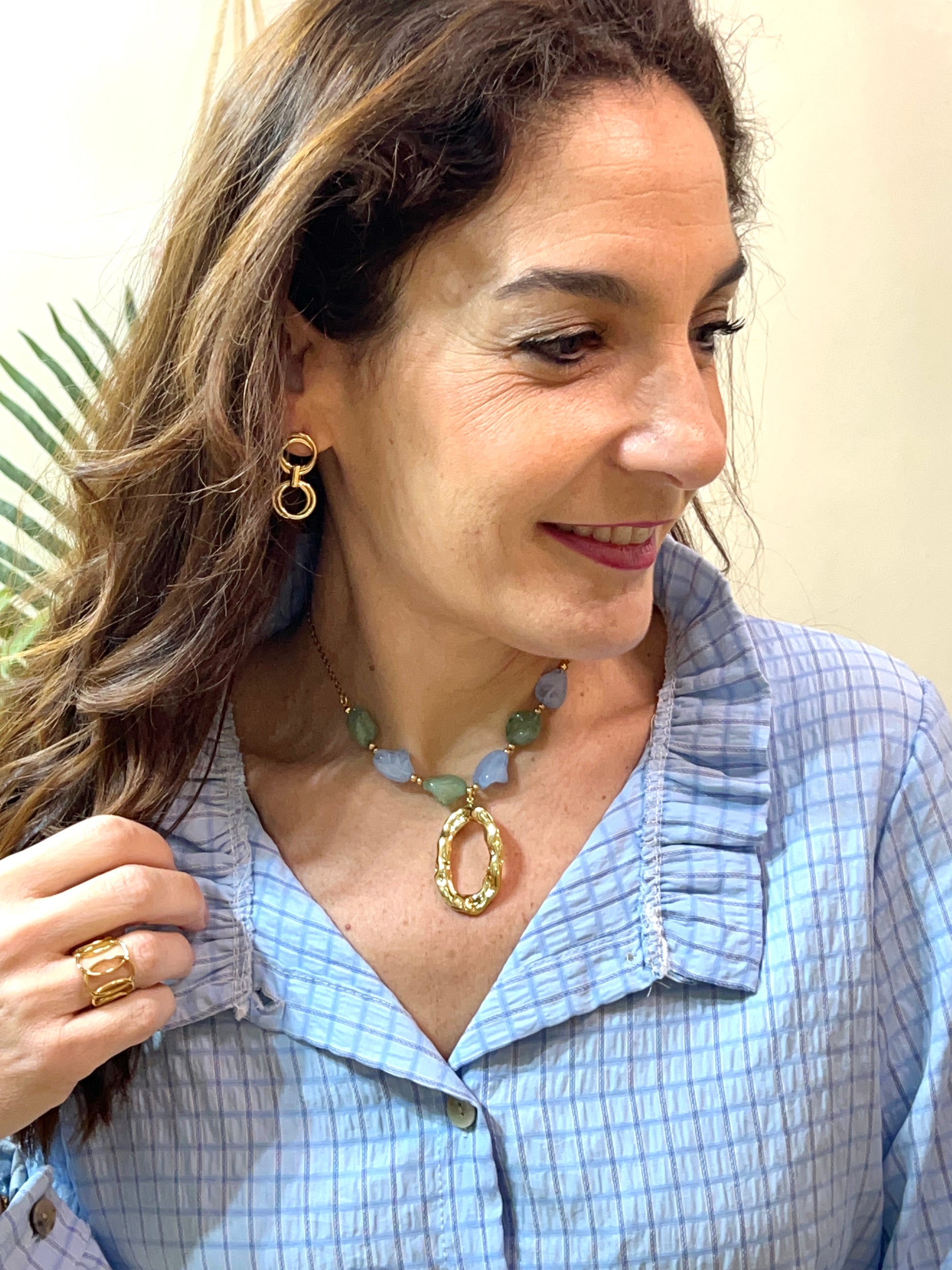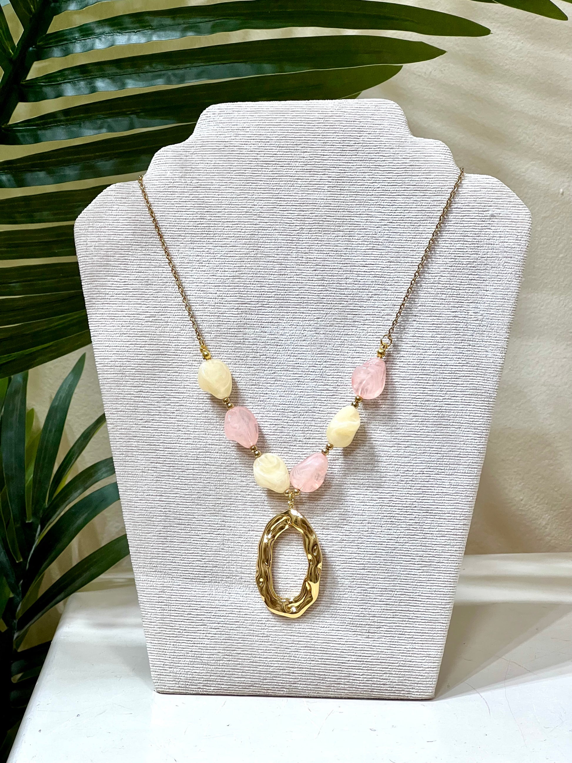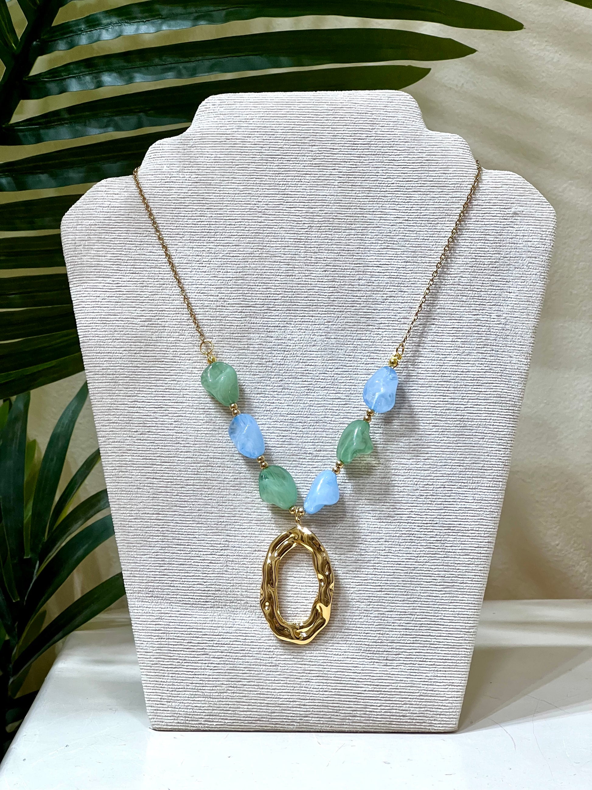 Collar de acero inoxidable con bolitas maxi de color y centro de óvalo de acero. Cierre de mosquetón y cadena alargadera. Acero quirúrgico e hipoalergénico, resistente al agua y al sudor. Largo cadena: 40+5cm.
