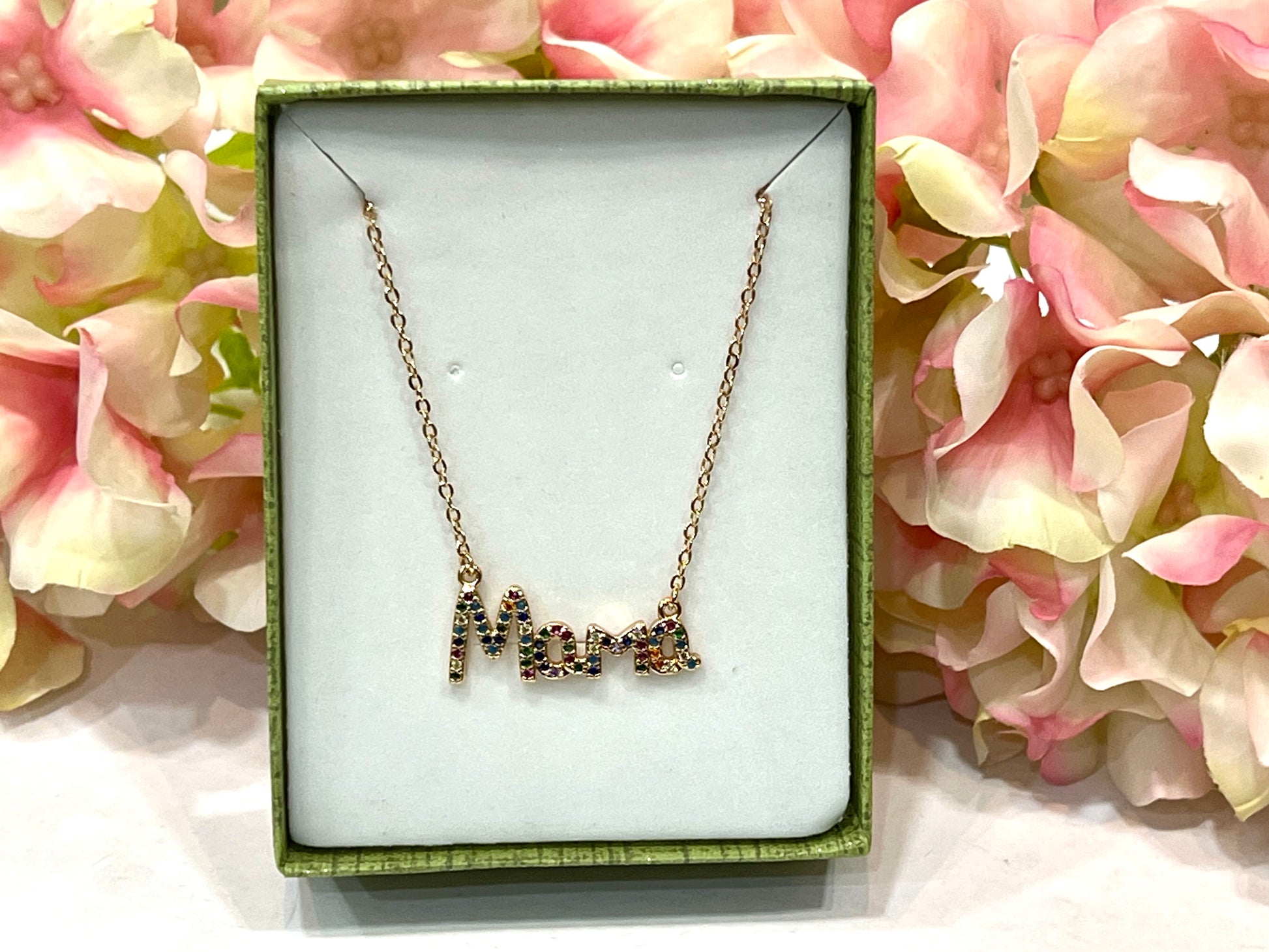 Collar de bisutería fina con el letrero “Mamá” central con brillito. Largo 40+5cm.