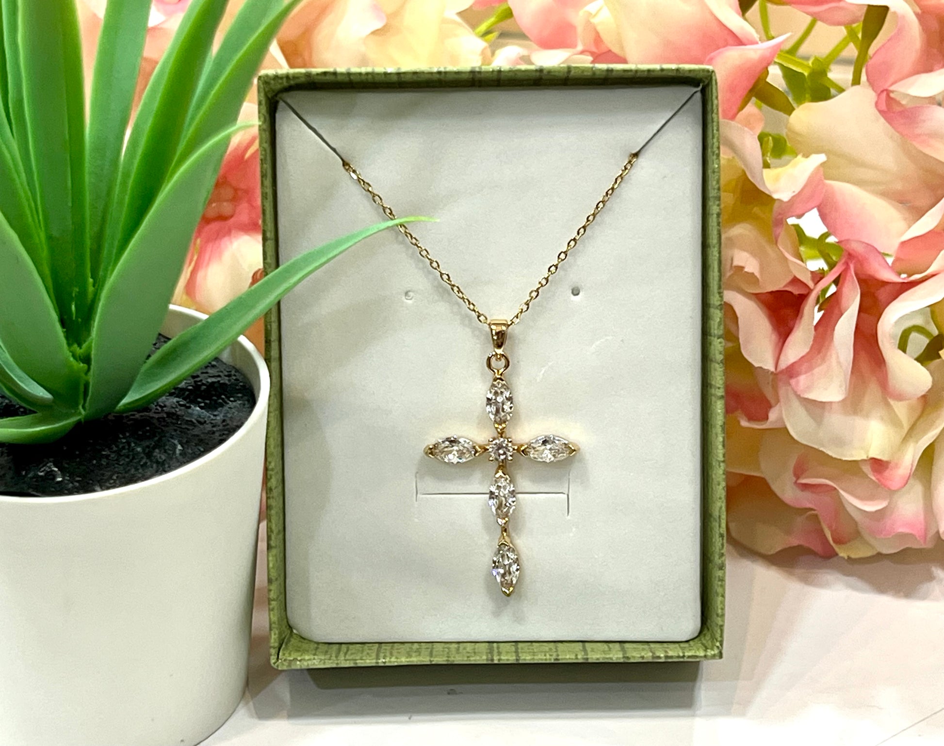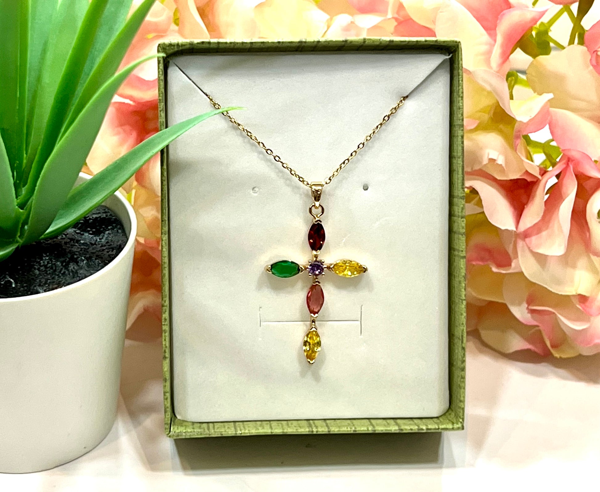 Collar de acero inoxidable con cruz latina de zirconita lisa o de color. Acero quirúrgico e hipoalergénico, resistente al agua y al sudor. Largo total: 40+ 5 cm.