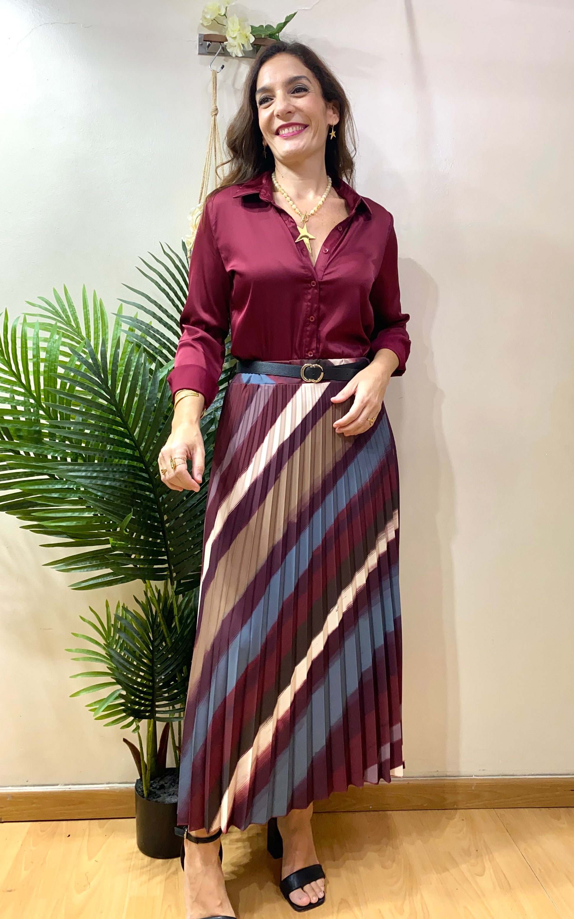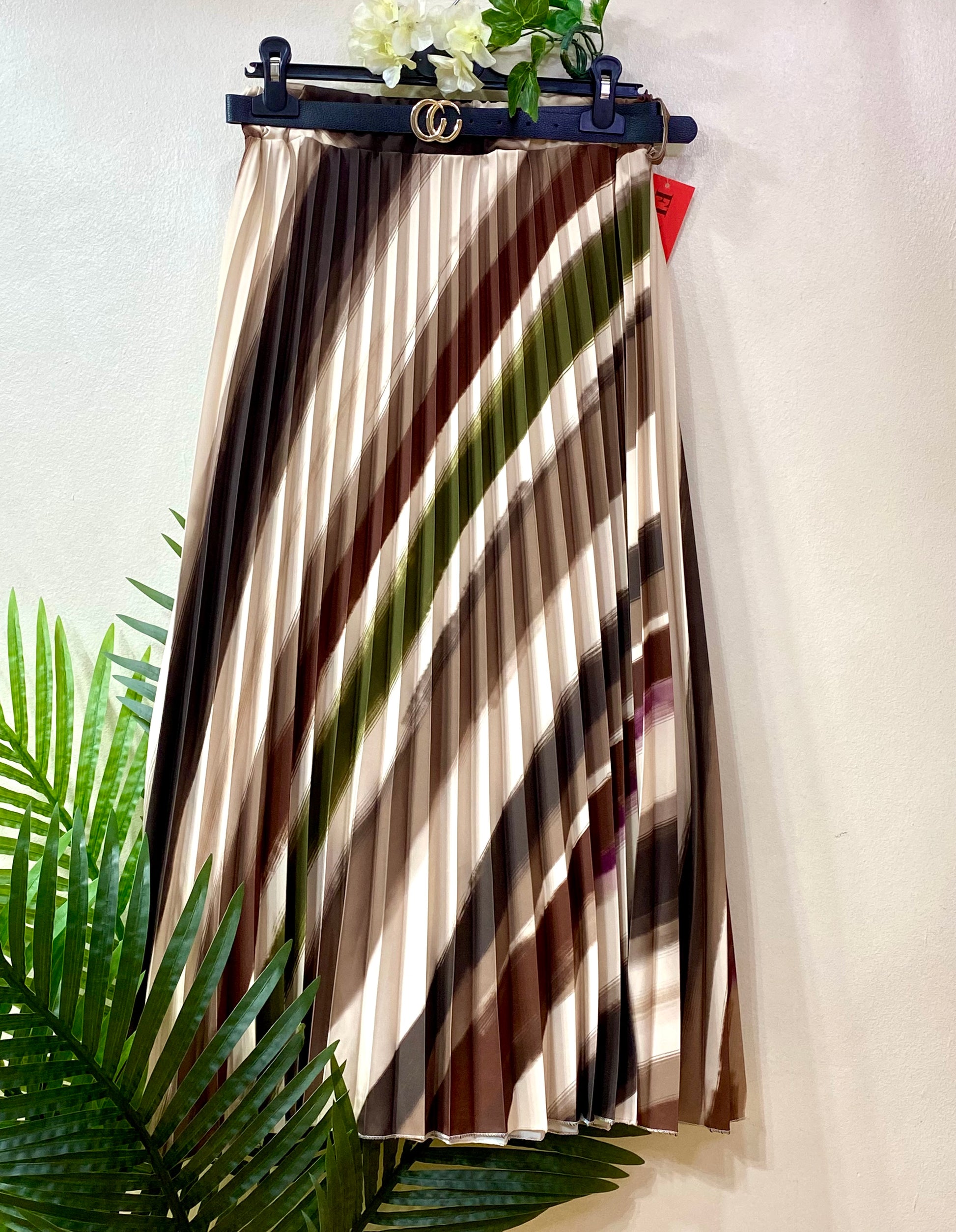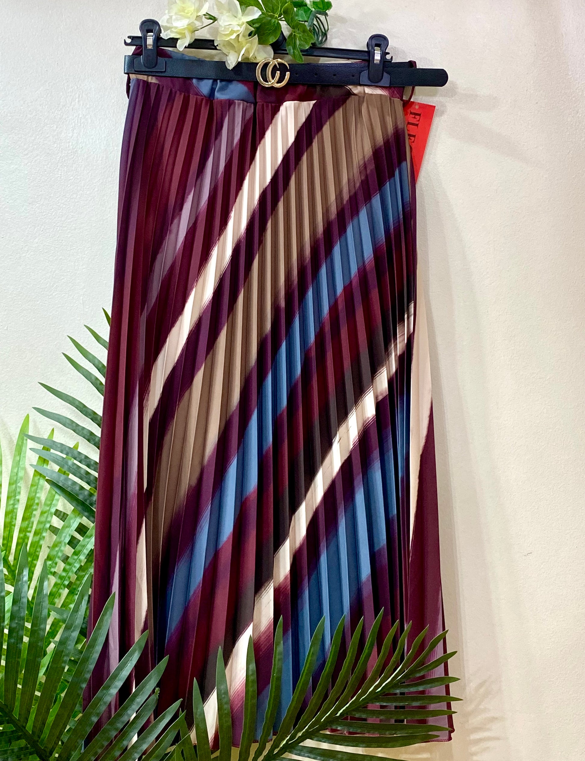 Falda plisada larga con estampado a rayas verticales inclinadas. Incluye cinturón negro de polipiel. Cinturilla elástica. Talla única (perfecto para tallas 38, 40 y 42). Tejido de calidad: 95% poliester y 5% elastán.
