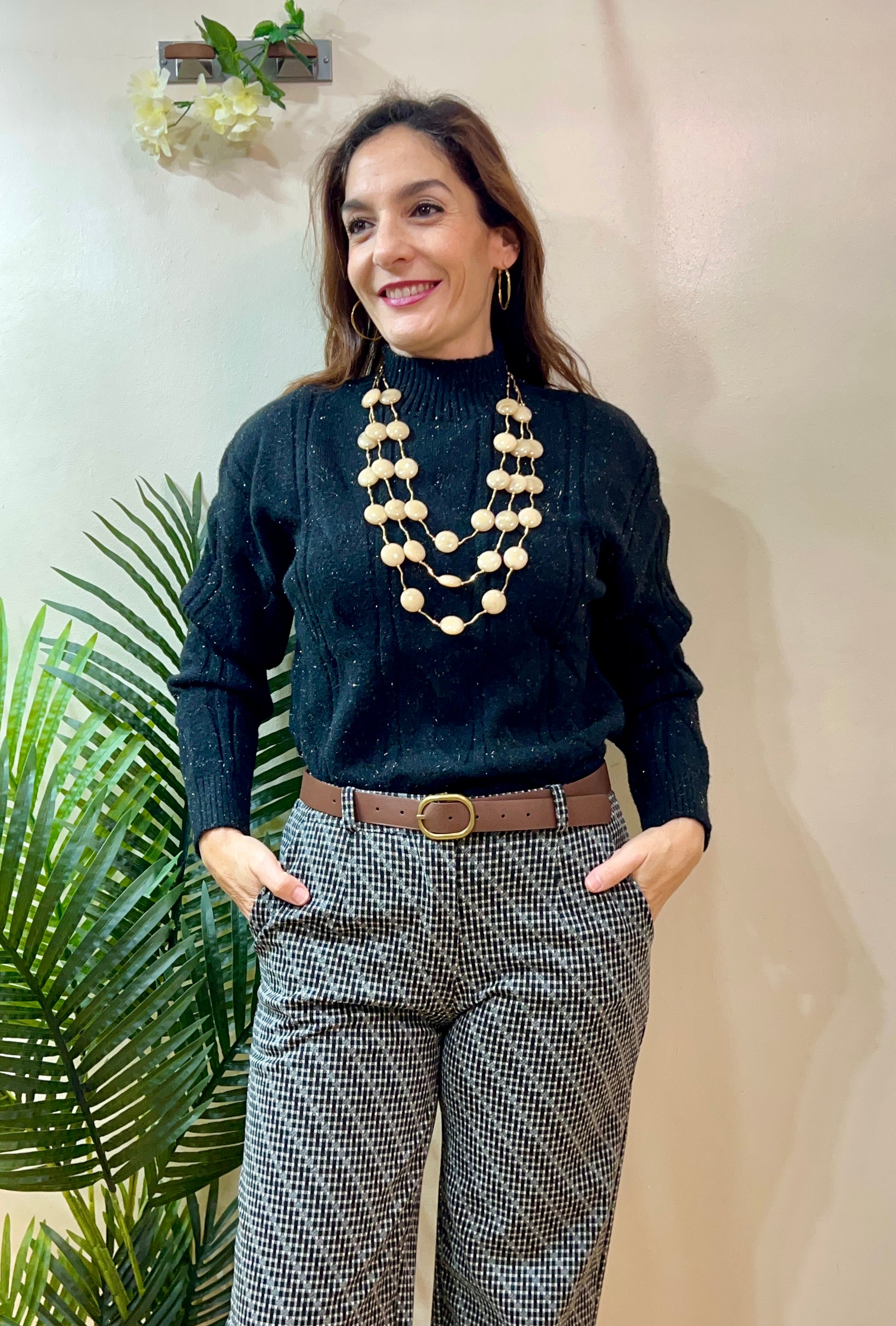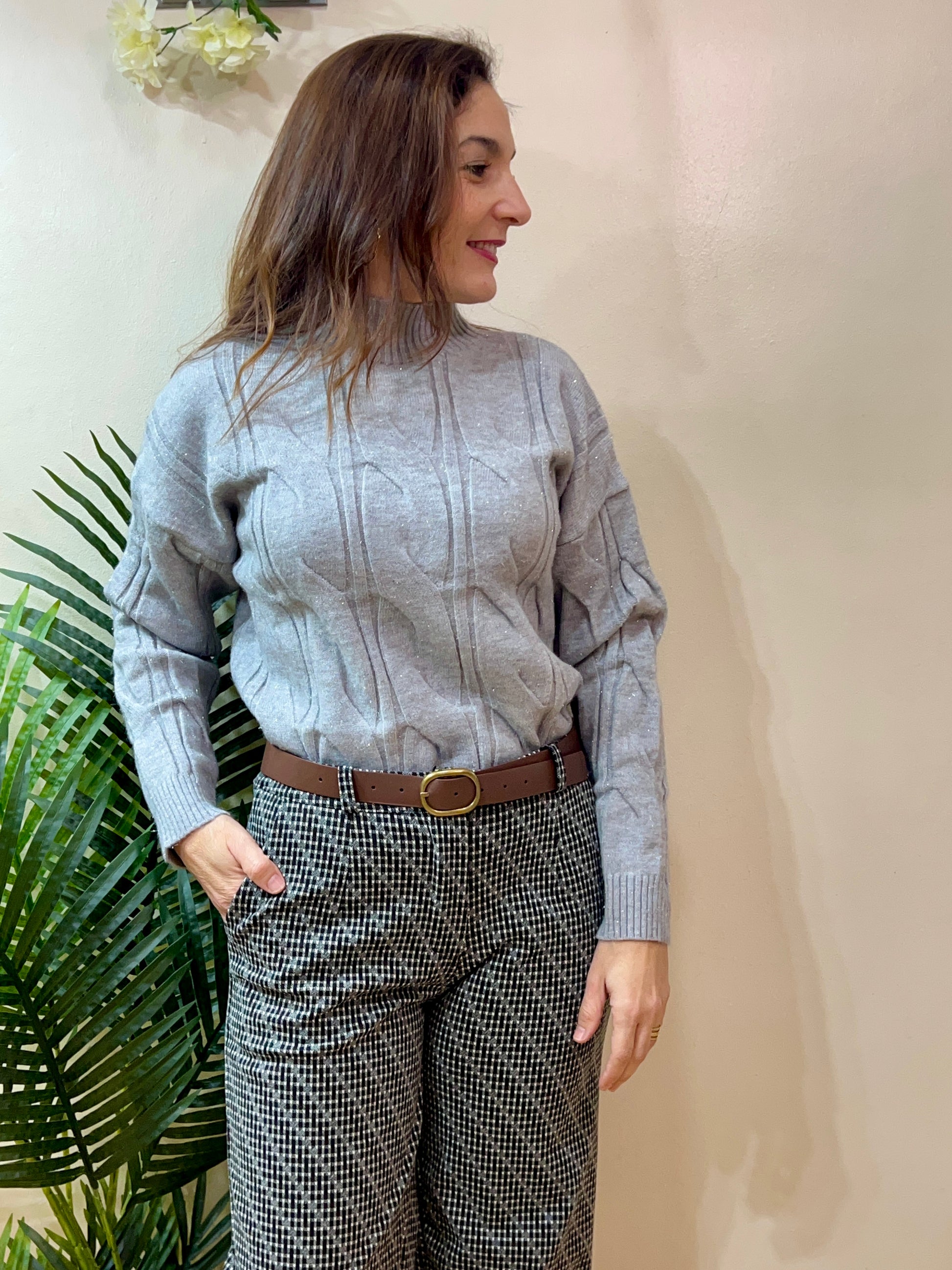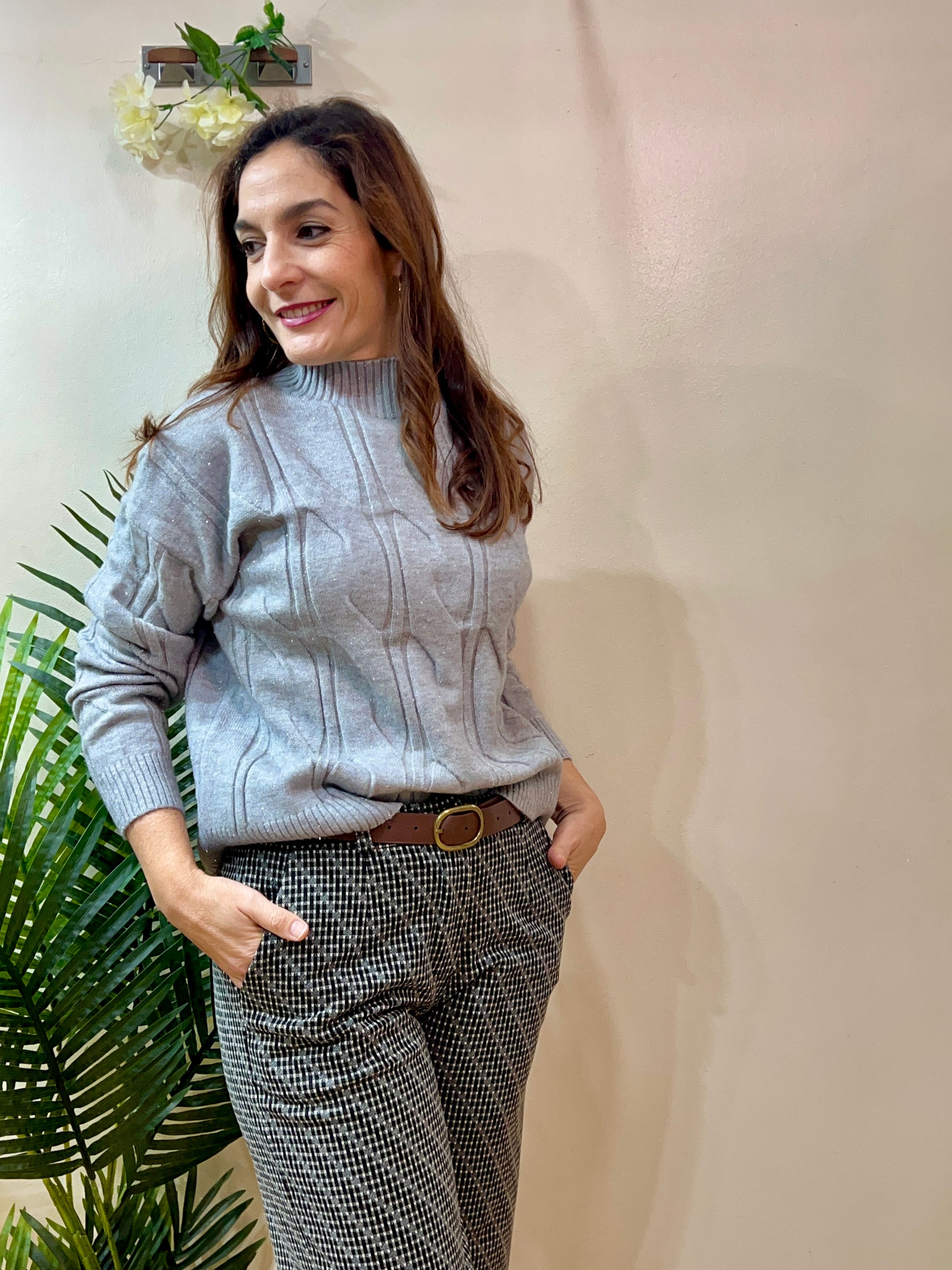 Jersey de lana suave con dibujos de “ochitos” , toque de brillo muy sutil y cuello perkin. Dos tallas S-M (para tallas 40 y 42) y L-XL (para tallas 44-46). Composición: 40% poliamida, 20% lurex, 15% poliester, 15% elastano y 10% metallicthread.