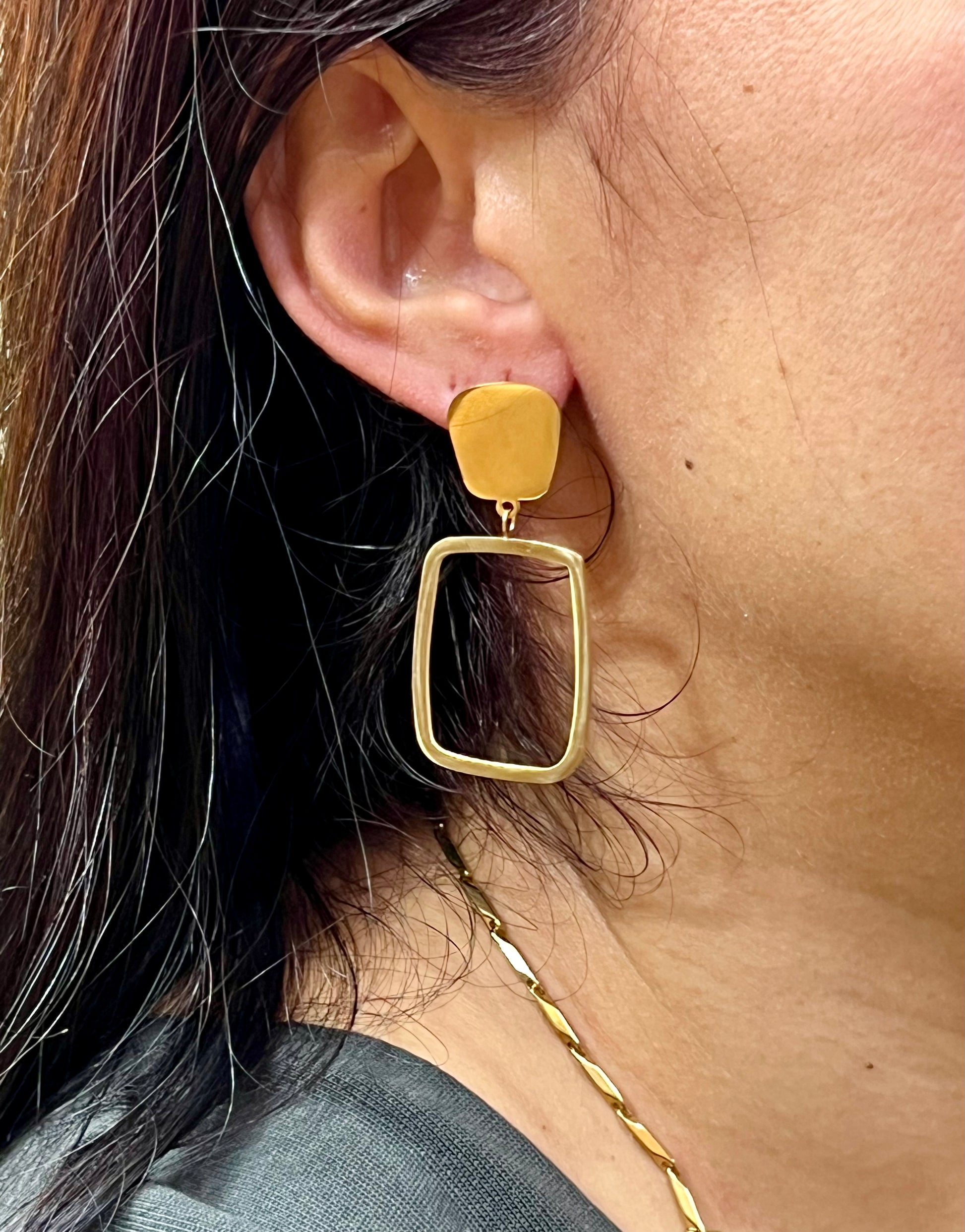 Pendientes de acero inoxidable en forma de cuadrado maxi. Acero quirúrgico e hipoalergénico, resistente al agua y al sudor. Largo 5 cm. Cierre de tornillo.