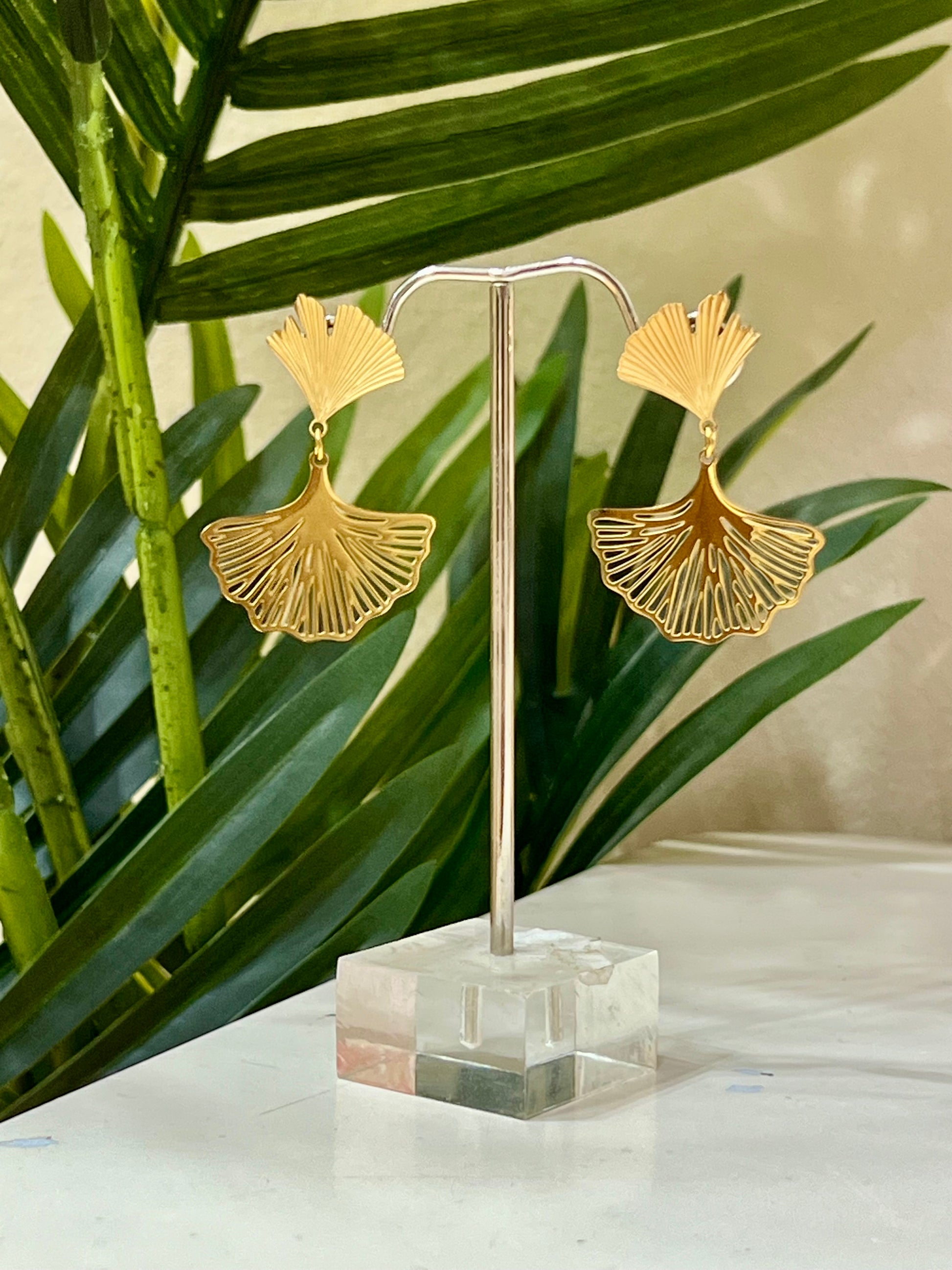 Pendientes en acero con doble fornitura en forma de abanico calado, con movimiento. Acero hipoalergénico y quirúrgico. Resistente al agua y al sudor. Largo total 4cm. Cierre de tornillo.