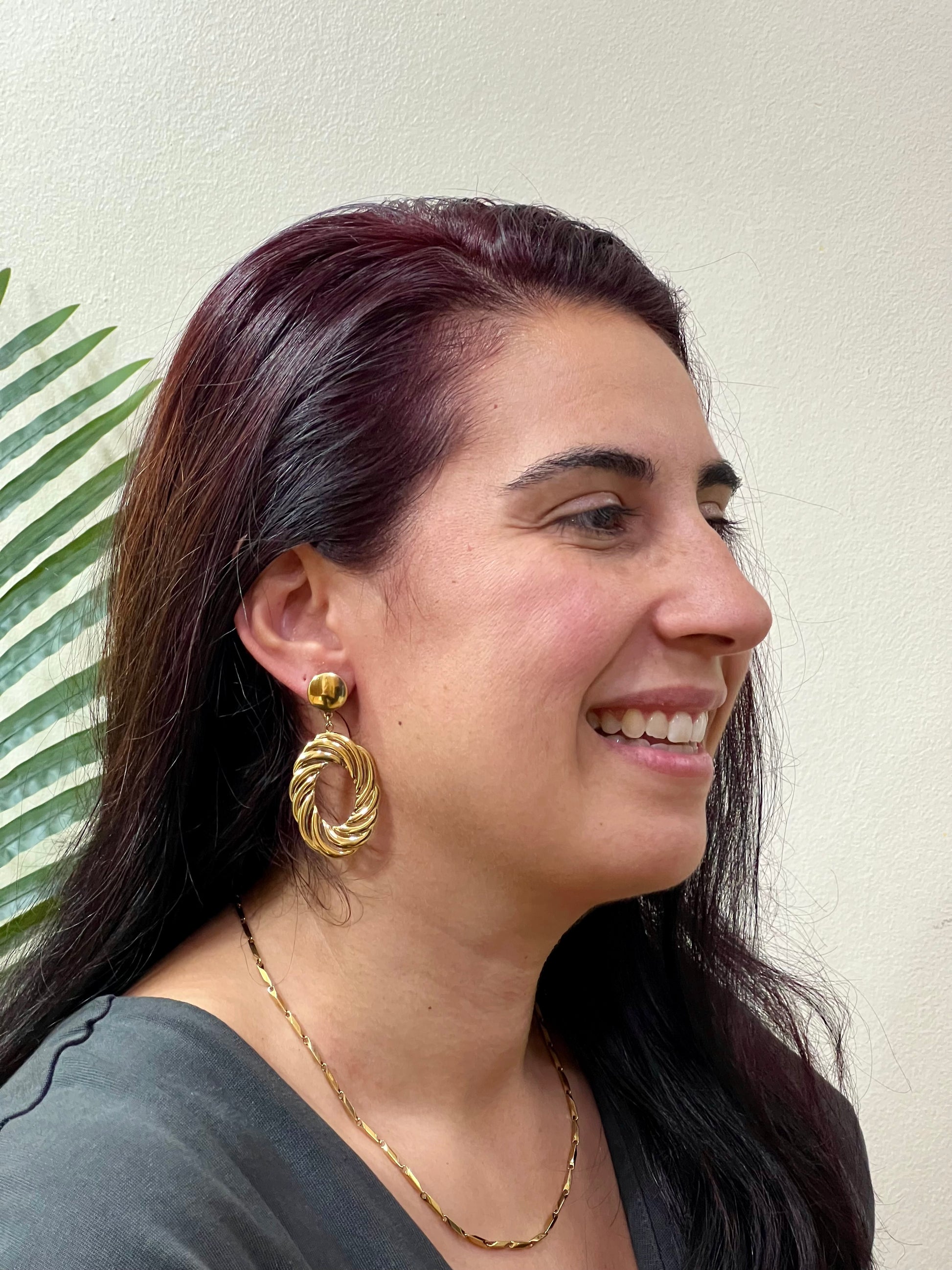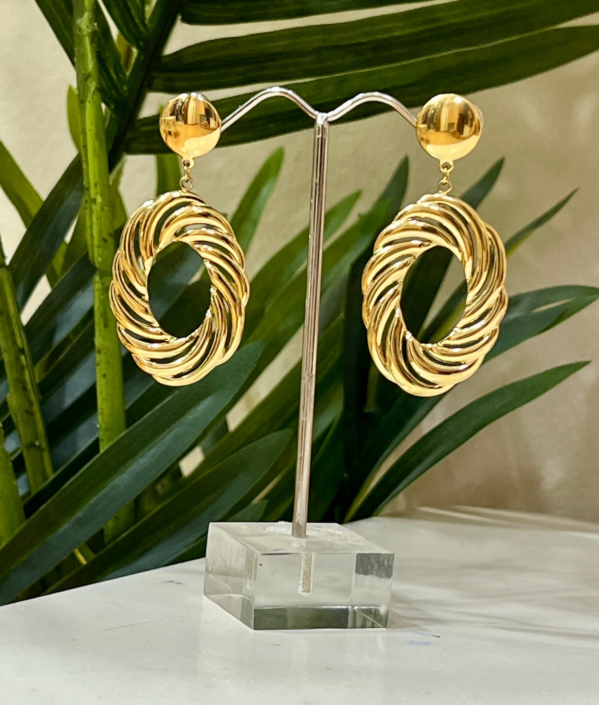 Pendientes de acero inoxidable en forma de ovalo labrado maxi. Acero quirúrgico e hipoalergénico, resistente al agua y al sudor. Largo 6 cm. Cierre de tornillo.