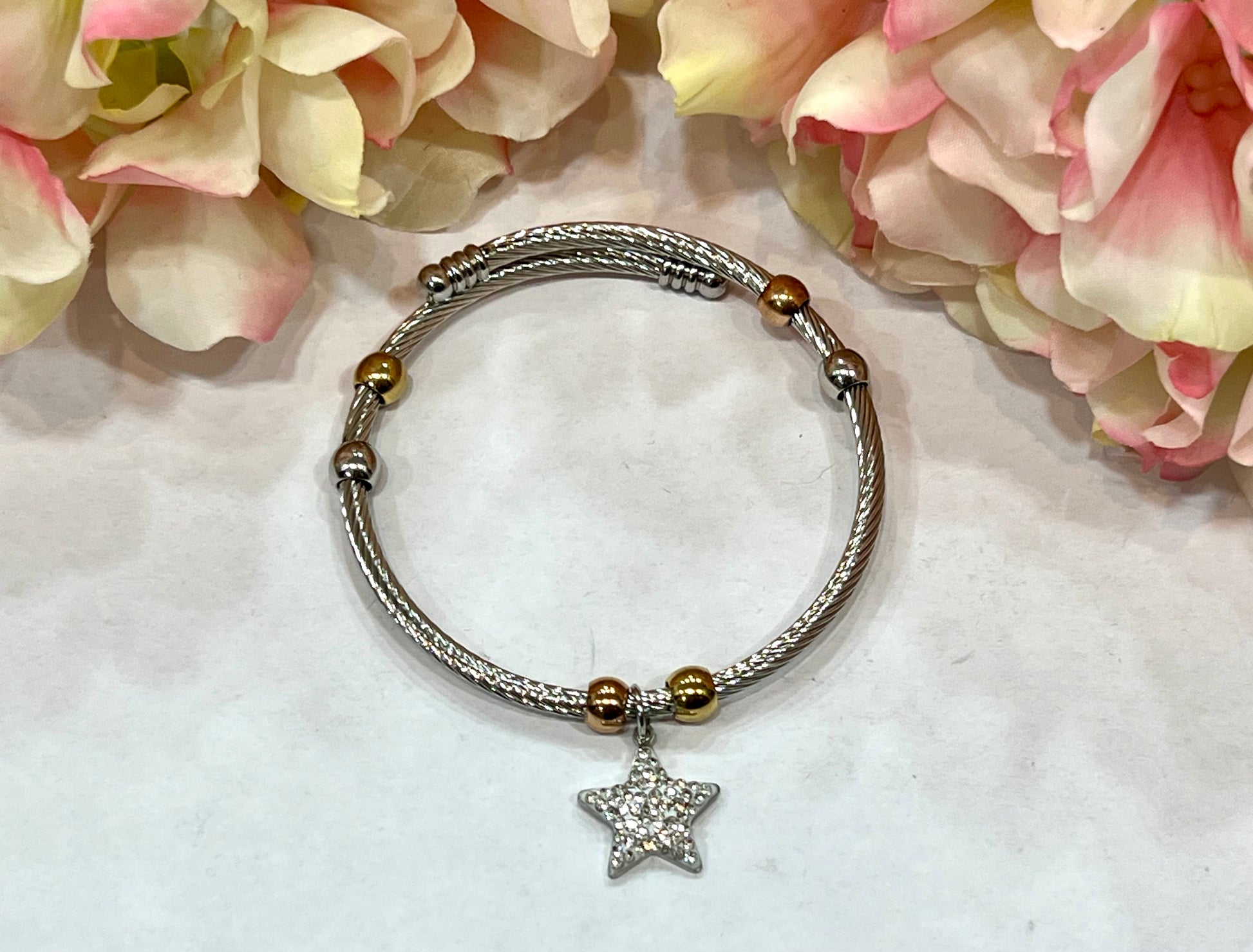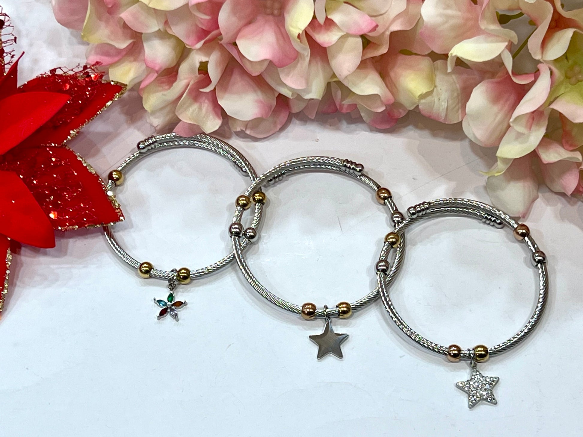 Pulseras de acero inoxidable tipo aro/caña con colgante variado. Ajustable. Acero quirúrgico e hipoalergénico, resistente al agua y al sudor.