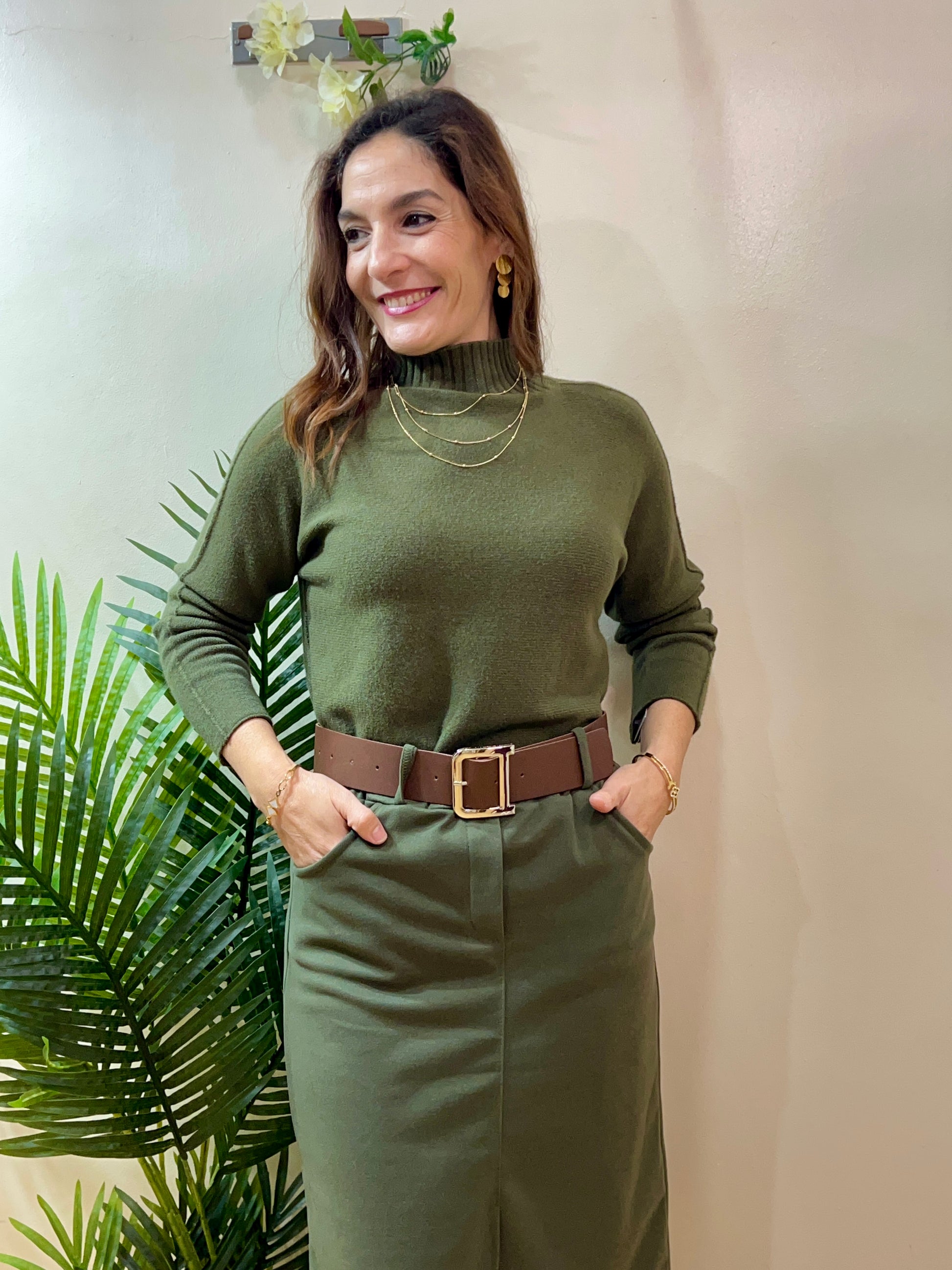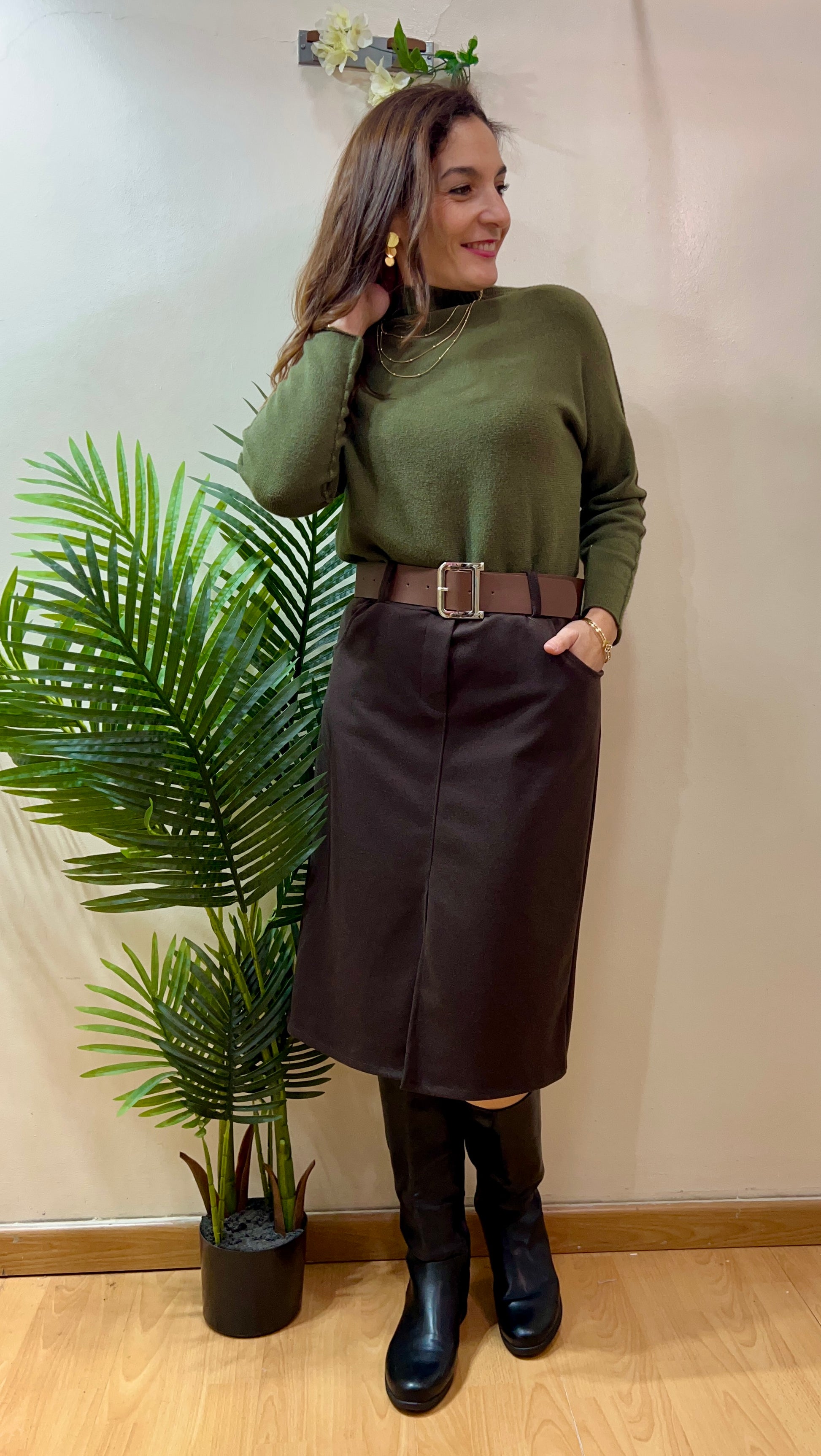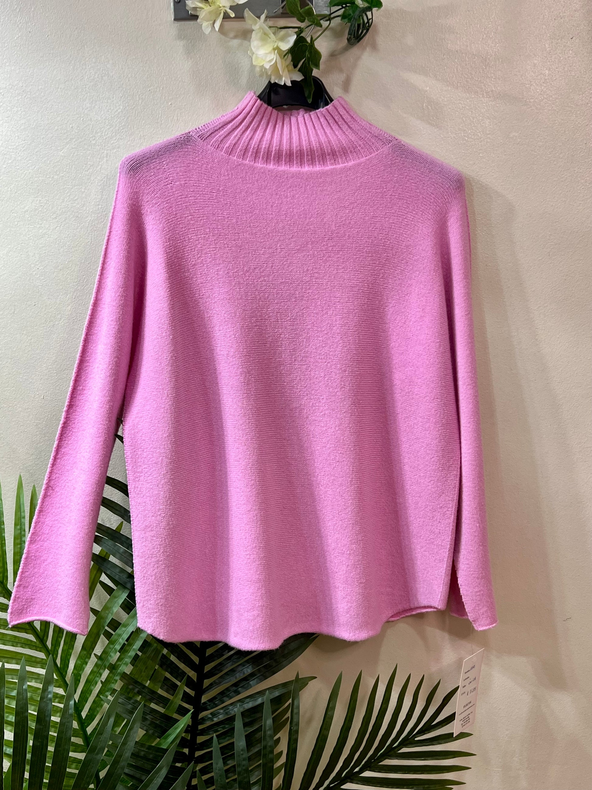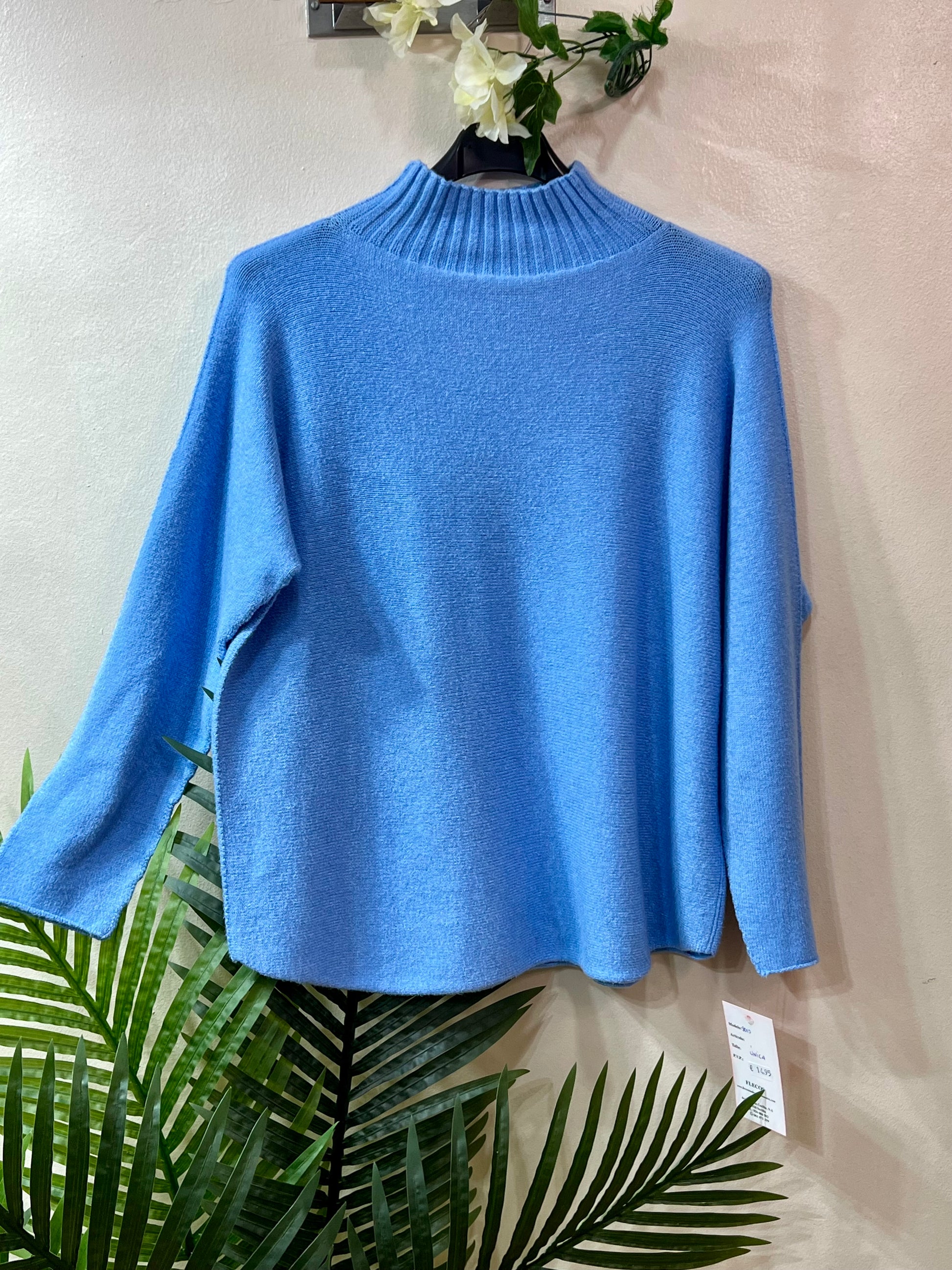 Suéter de punto muy suave y esponjoso con cuello perkin. Talla única (amplio, perfecto para tallas 42, 44 y 46). Tejido de calidad. Composición: 52% viscosa, 26% poliester y 22% nylon.