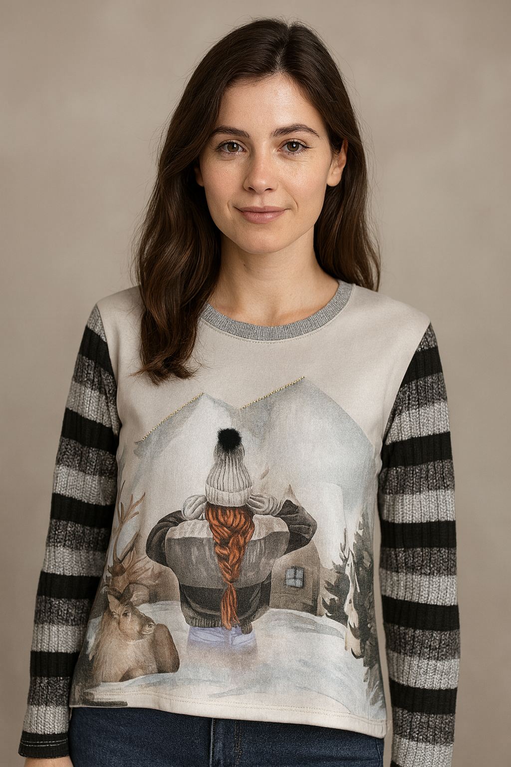 Jersey estampado con paisaje invernal y niña con gorro y pompón. Mangas combi a rayas. Escote a la caja. Manga larga, hombreras, fabricación nacional con terminaciones de calidad. Por tallas. Tejido 92%poliester y 8% elastomero.