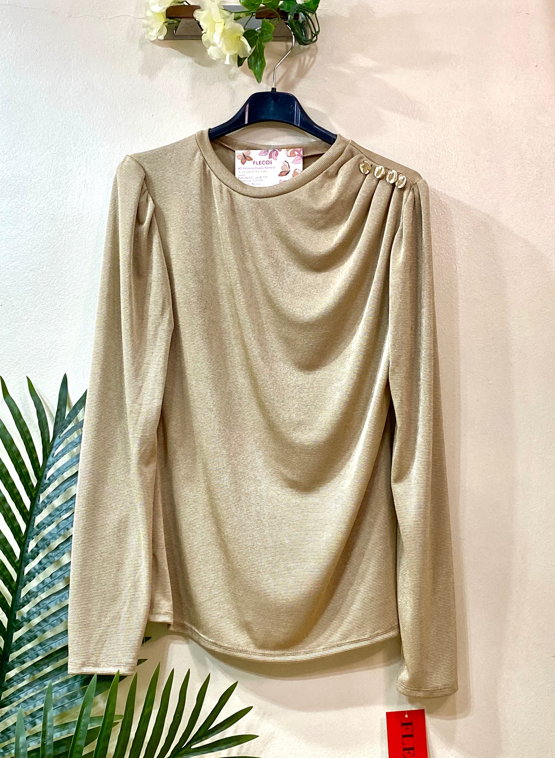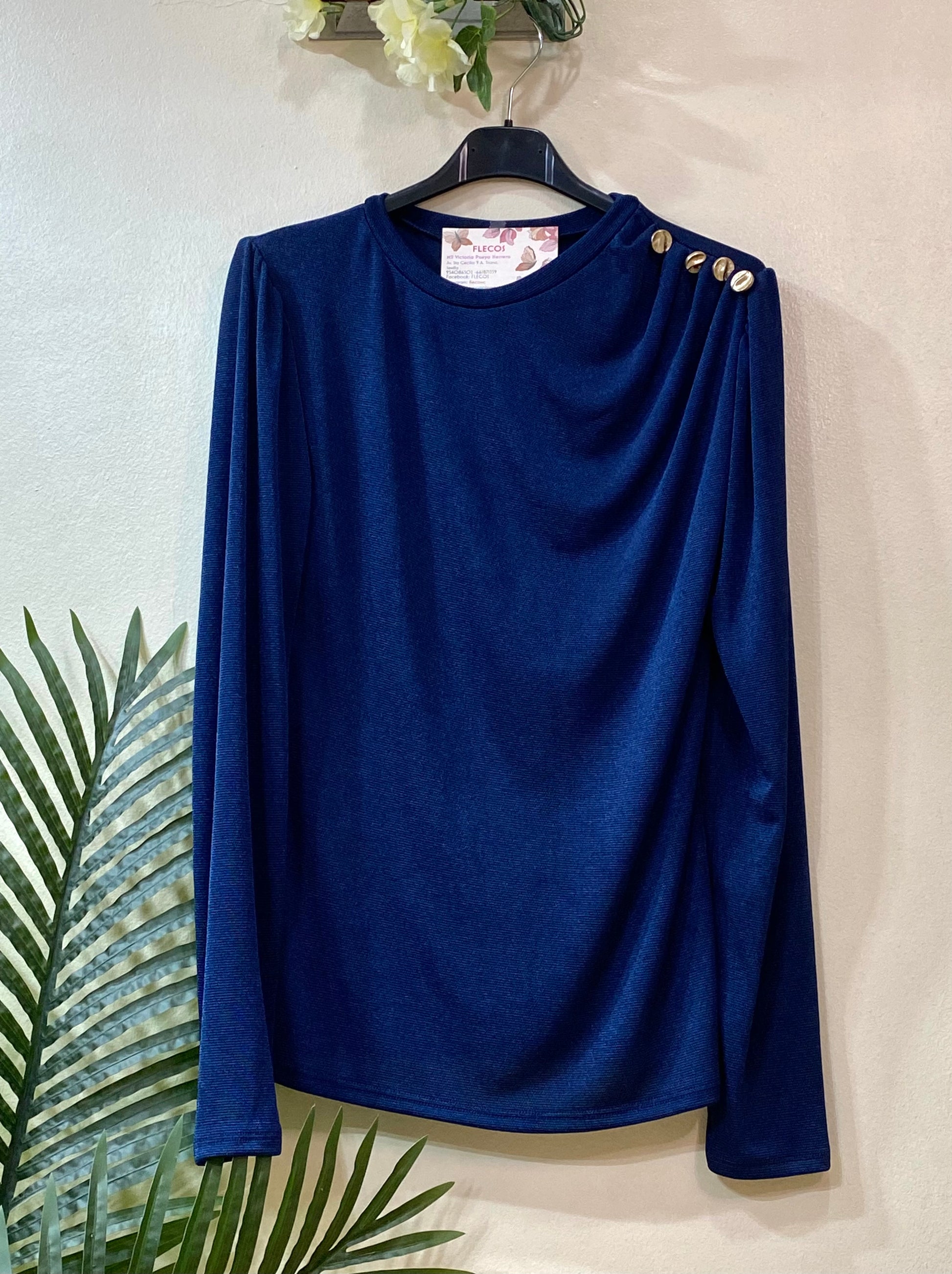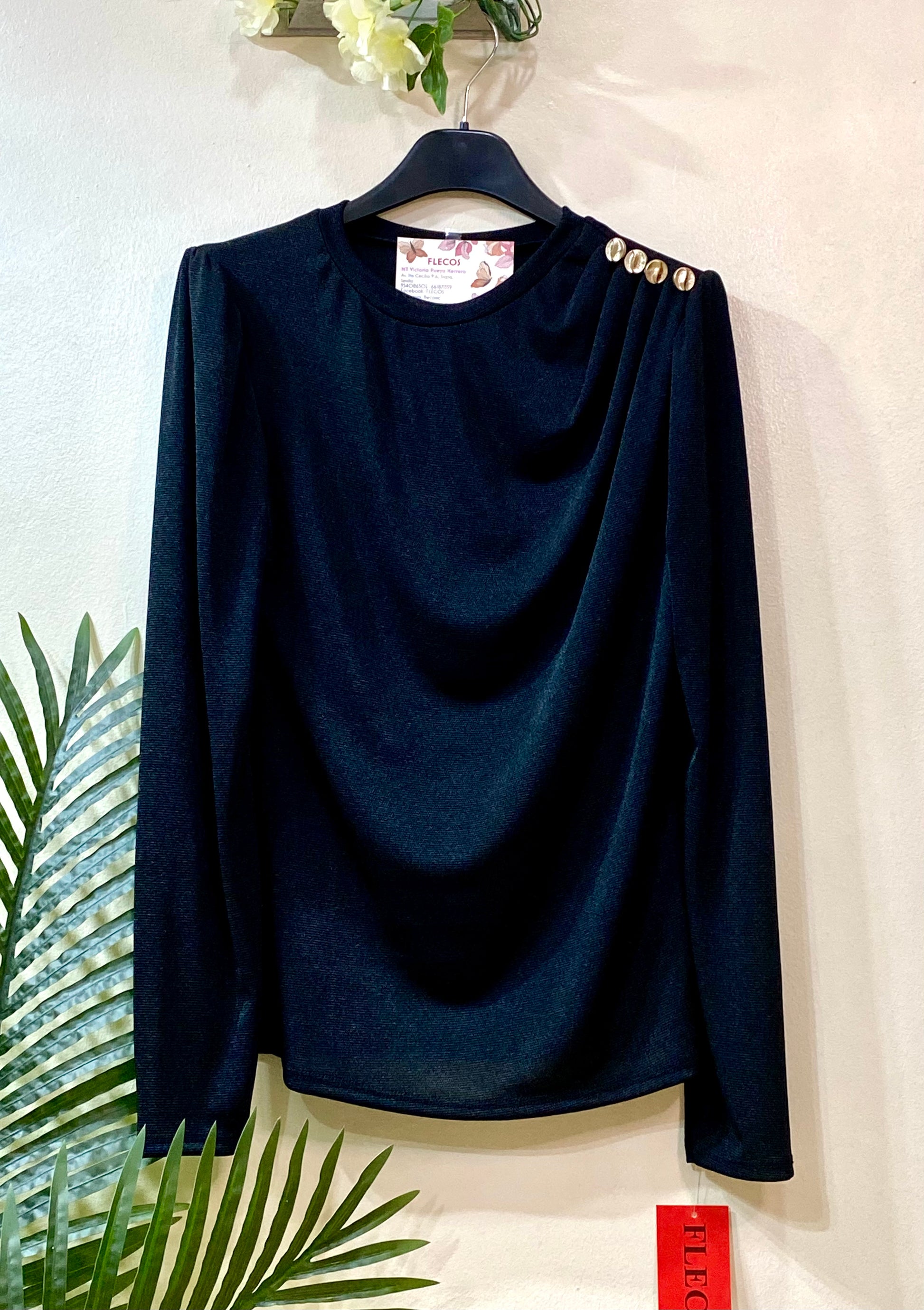 Top de punto fino elástico con detalle drapeado y cuatro botones en el hombro izquierdo. Escote a la caja. Talla única (perfecto para tallas 36 hasta la 42). Composición: 95% poliester y 5% elastano.