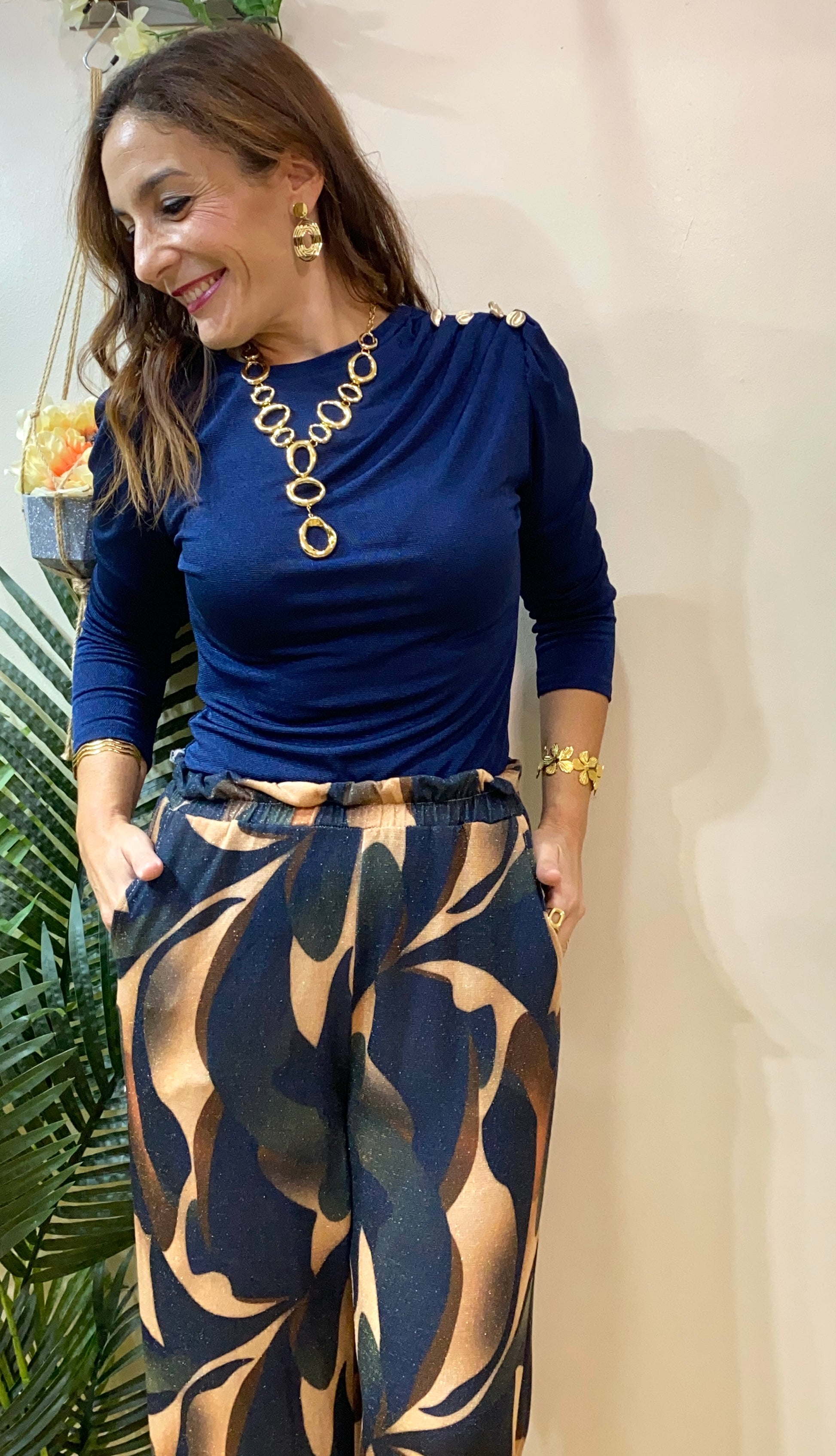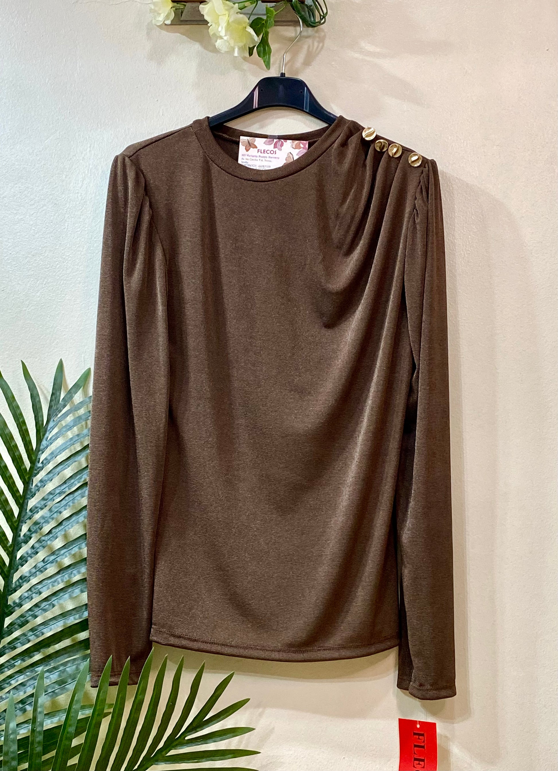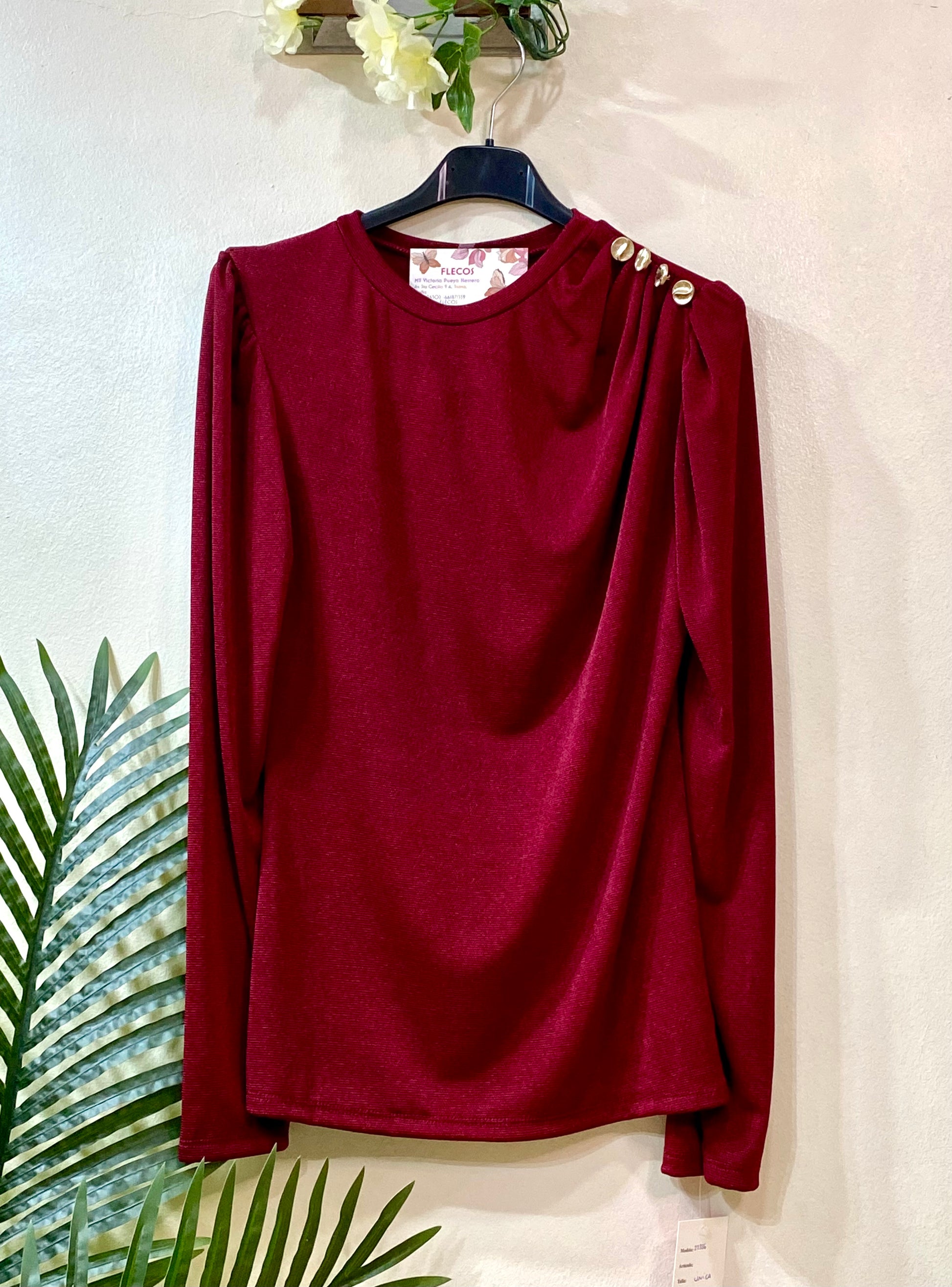 Top de punto fino elástico con detalle drapeado y cuatro botones en el hombro izquierdo. Escote a la caja. Talla única (perfecto para tallas 36 hasta la 42). Composición: 95% poliester y 5% elastano.